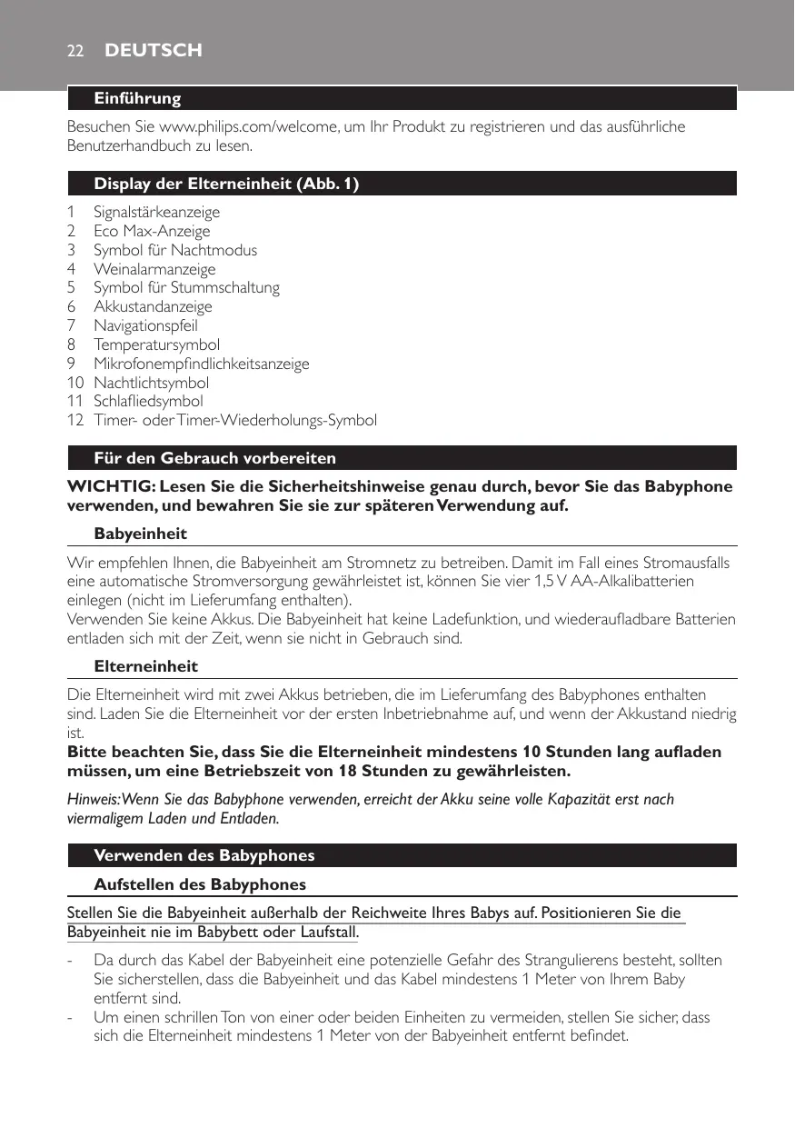 Deutsch Einführung Besuchen Sie www.philips.com/welcome, um Ihr Produkt zu registrieren und das ausführliche Benutzerhandbuch zu lesen. Display der Elterneinheit (Abb. 1)