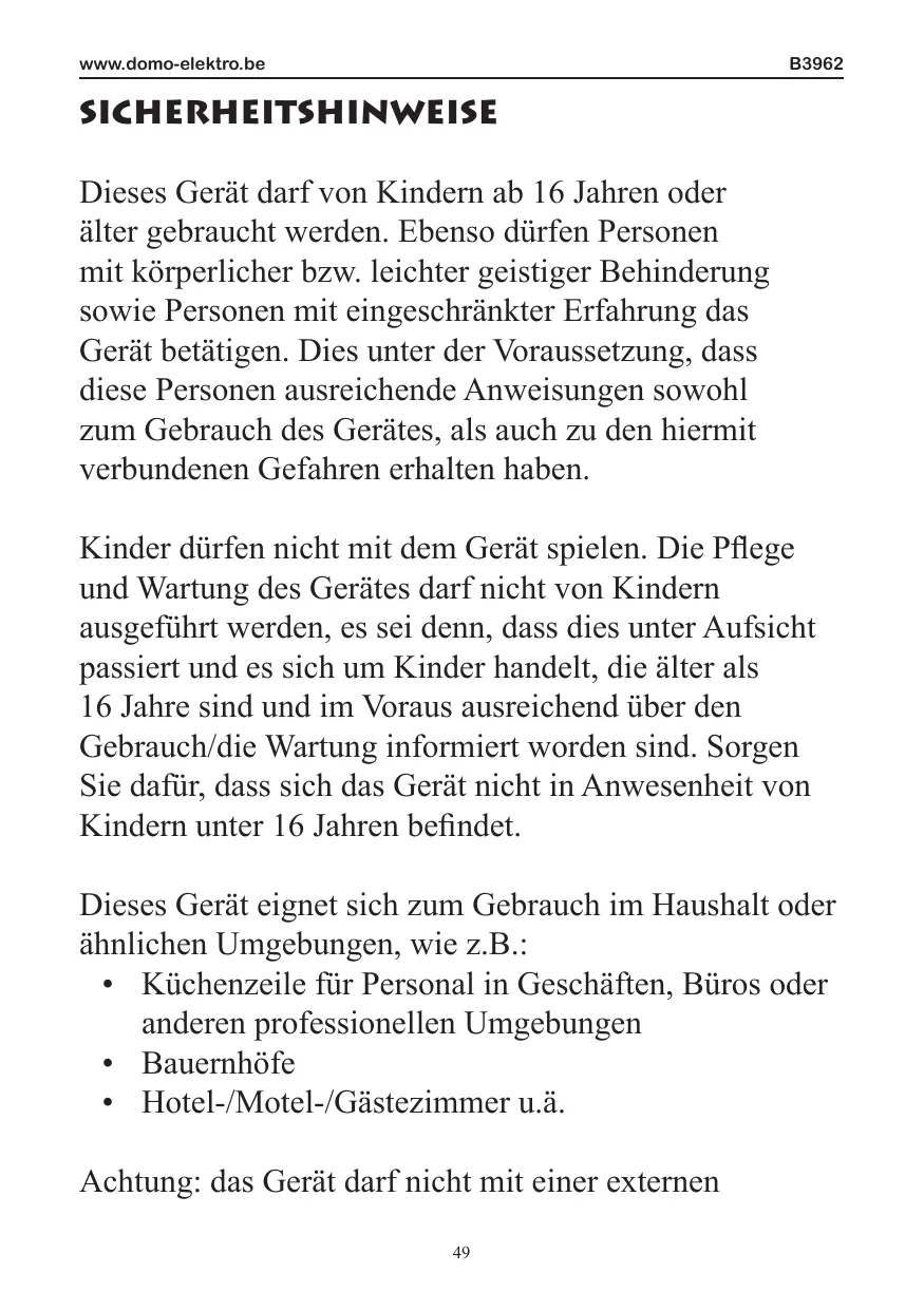 www.domo-elektro.be B3962 SICHERHEITSHINWEISE Dieses Gerät darf von Kindern ab 16 Jahren oder älter gebraucht werden. Ebenso dürfen Personen mit körperlicher bzw. leichter geistiger Behinderung sowie Personen mit eingeschränkter Erfahrung das Gerät betätigen. Dies unter der Voraussetzung, dass diese Personen ausreichende Anweisungen sowohl zum Gebrauch des Gerätes, als auch zu den hiermit verbundenen Gefahren erhalten haben. Kinder dürfen nicht mit dem Gerät spielen. Die Pflege und Wartung des Gerätes darf nicht von Kindern ausgeführt werden, es sei denn, dass dies unter Aufsicht passiert und es sich um Kinder handelt, die älter als 16 Jahre sind und im Voraus ausreichend über den Gebrauch/die Wartung informiert worden sind. Sorgen Sie dafür, dass sich das Gerät nicht in Anwesenheit von Kindern unter 16 Jahren befindet. Dieses Gerät eignet sich zum Gebrauch im Haushalt oder ähnlichen Umgebungen, wie z.B.: