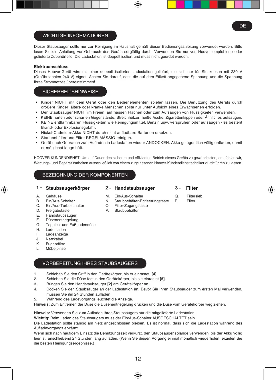 DE Wichtige Informationen Dieser Staubsauger sollte nur zur Reinigung im Haushalt gemäß dieser Bedienungsanleitung verwendet werden. Bitte lesen Sie die Anleitung vor Gebrauch des Geräts sorgfältig durch. Verwenden Sie nur von Hoover empfohlene oder gelieferte Zubehörteile. Die Ladestation ist doppelt isoliert und muss nicht geerdet werden.