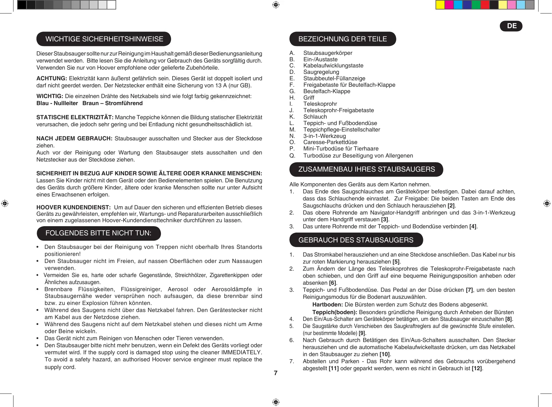 Den Staubsauger bei der Reinigung von Treppen nicht oberhalb Ihres Standorts positionieren! Den Staubsauger nicht im Freien, auf nassen Oberflächen oder zum Nassaugen verwenden. Vermeiden Sie es, harte oder scharfe Gegenstände, Streichhölzer, Zigarettenkippen oder Ähnliches aufzusaugen. Brennbare Flüssigkeiten, Flüssigreiniger, Aerosol oder Aerosoldämpfe in Staubsaugernähe weder versprühen noch aufsaugen, da diese brennbar sind bzw. zu einer Explosion führen könnten. Während des Saugens nicht über das Netzkabel fahren. Den Gerätestecker nicht am Kabel aus der Netzdose ziehen. Während des Saugens nicht auf dem Netzkabel stehen und dieses nicht um Arme oder Beine wickeln. Das Gerät nicht zum Reinigen von Menschen oder Tieren verwenden. Den Staubsauger bitte nicht mehr benutzen, wenn ein Defekt des Geräts vorliegt oder vermutet wird. If the supply cord is damaged stop using the cleaner IMMEDIATELY. To avoid a safety hazard, an authorised Hoover service engineer must replace the supply cord. Staubsaugerkörper Ein-/Austaste Kabelaufwicklungstaste Saugregelung Staubbeutel-Füllanzeige Freigabetaste für Beutelfach-Klappe Beutelfach-Klappe Griff Teleskoprohr Teleskoprohr-Freigabetaste Schlauch Teppich- und Fußbodendüse Teppichpflege-Einstellschalter 3-in-1-Werkzeug Caresse-Parkettdüse Mini-Turbodüse für Tierhaare Turbodüse zur Beseitigung von Allergenen Gebrauch des Staubsaugers