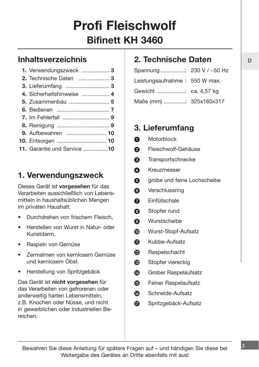 BEDIENUNGSANLEITUNG BIFINETT KH 3460 HACHOIR A VIANDE PROFESSIONNEL KOMPERNASS