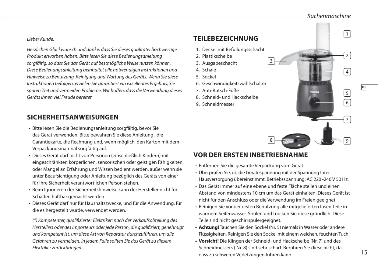 - Tristar ist nicht verantwortlich für Material- oder Personenschäden, die durch unsachgemäß Handhabung oder durch unsachgemäß Ausführung der Sicherheitsanweisungen verursacht werden.