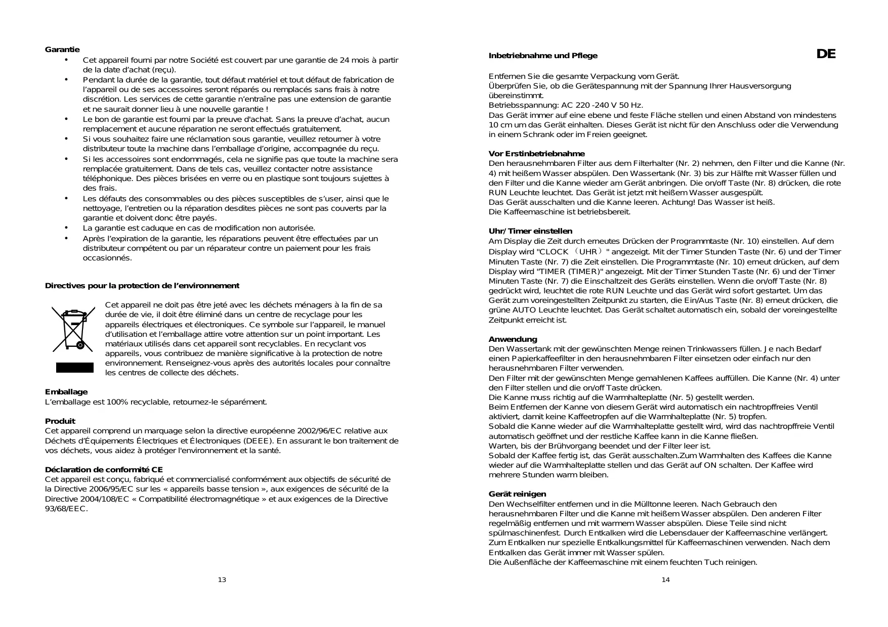 Den Wechselfilter entfernen und in die Müllonne leeren. Nach Gebrauch den Herausnehmbaren Filter und die Kanne mit heißen Wasser abspullen. Den anderen Filter regelmäßigen entfernen und mit warmem Wasser abspullen. Diese Teile sind nicht spulmaschinenfest. Durch Entkalken wird die Lebensdauer der Kaffeemaschine verlangert. Zum Entkalken nur spezielle Entkalkungsmittel für Kaffeemaschinen verwenden. Nach dem Entkalken das Gerät immer mit Wasser spulen.