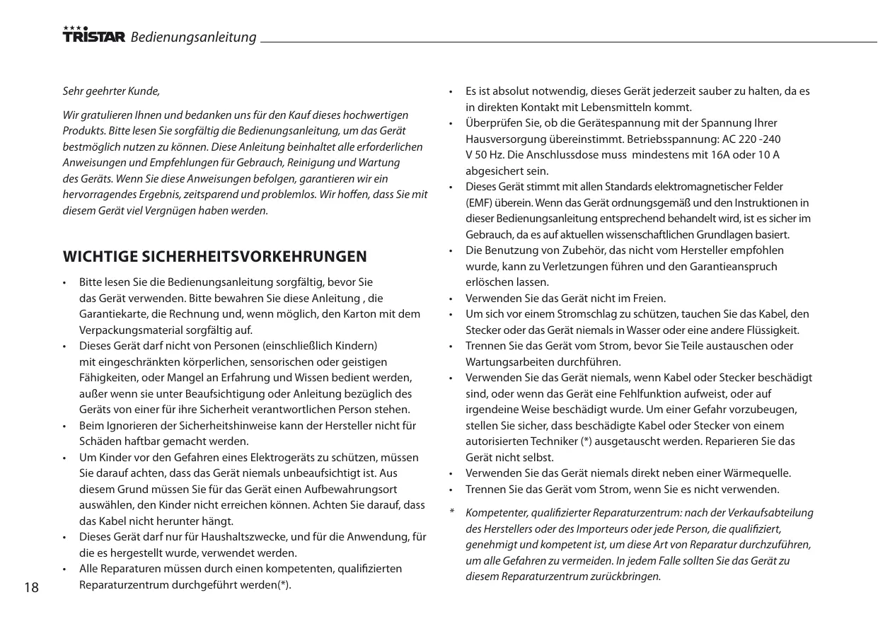 - Tristar ist nicht verantwortlich für Material- oder Personenschäden, die durch unsachgemäß Handhabung oder durch unsachgemäß Ausführung der Sicherheitsanweisungen verursacht werden.