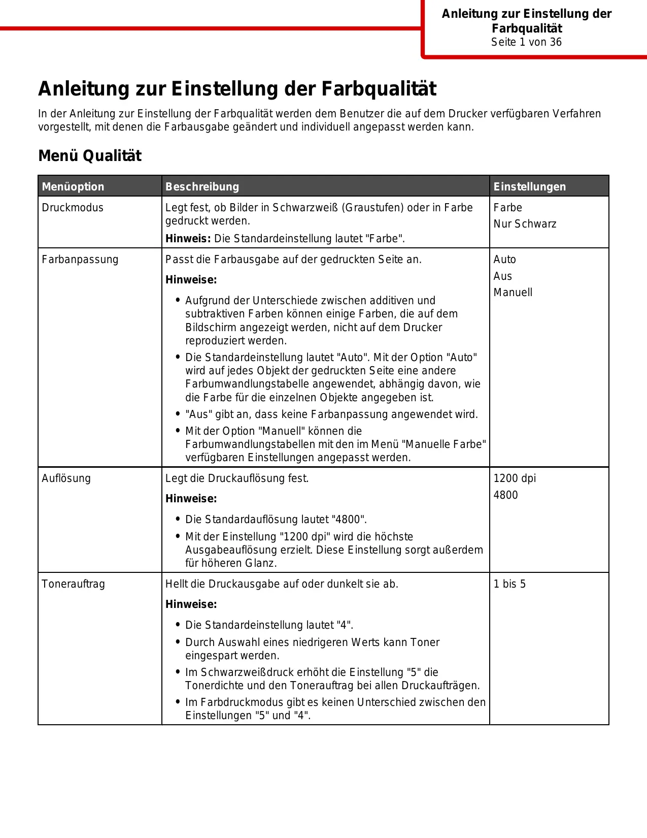 Anleitung zur Einstellung der Farbqualität In der Anleitung zur Einstellung der Farbqualität werden dem Benutzer die auf dem Drucker verfügbaren Verfahren vorgestellt, mit denen die Farbausgabe geändert und individuell angepasst werden kann. Menü Qualität Menüoption Druckmodus Beschreibung Legt fest, ob Bilder in SchwarzweiR (Graustufen) oder in Farbe gedruckt werden. Hinweis: Die Standardeinstellung lautet "Farbe". Anleitung zur Einstellung der Farbqualität Seite 1 von 36 Einstellungen Farbe Nur Schwarz Farbanpassung Passt die Farbausgabe auf der gedruckten Seite an. Hinweise: + Aufgrund der Unterschiede zwischen additiven und subtraktiven Farben kônnen einige Farben, die auf dem Bildschirm angezeigt werden, nicht auf dem Drucker reproduziert werden. Die Standardeinstellung lautet "Auto". Mit der Option "Auto" wird auf jedes Objekt der gedruckten Seite eine andere Farbumwandlungstabelle angewendet, abhängig davon, wie die Farbe für die einzelnen Objekte angegeben ist. "Aus" gibt an, dass keine Farbanpassung angewendet wird. Mit der Option "Manuell" kônnen die Farbumwandlungstabellen mit den im Menü "Manuelle Farbe" verfügbaren Einstellungen angepasst werden. Auto Aus Manuell Auflôsung Legt die Druckauflôsung fest. Hinweise: + Die Standardauflôsung lautet "4800". + Mit der Einstellung "1200 dpi" wird die hôchste Ausgabeauflüsung erzielt. Diese Einstellung sorgt auRerdem für hôheren Glanz. 1200 dpi
