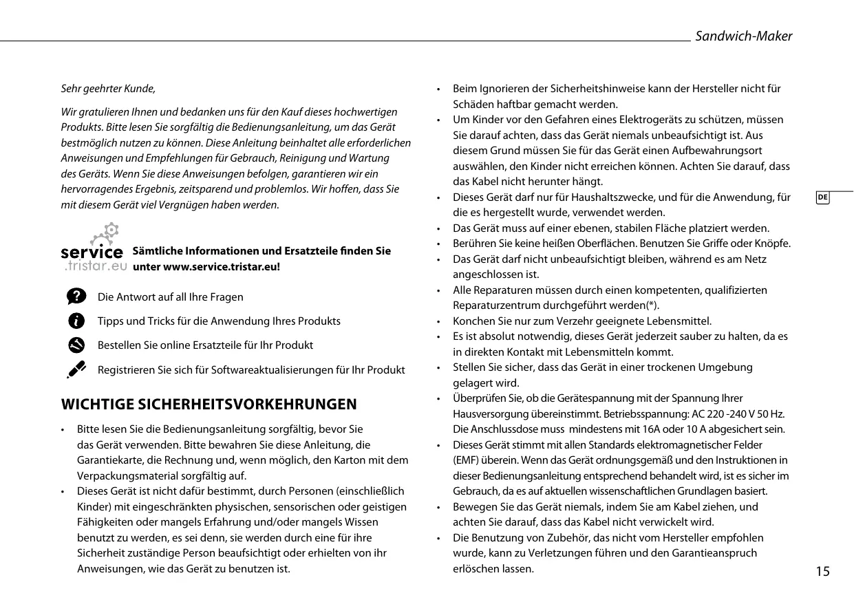 service Sümmtliche Informationen und Ersatzteile finden Sie unter www.service.tristar.eu!