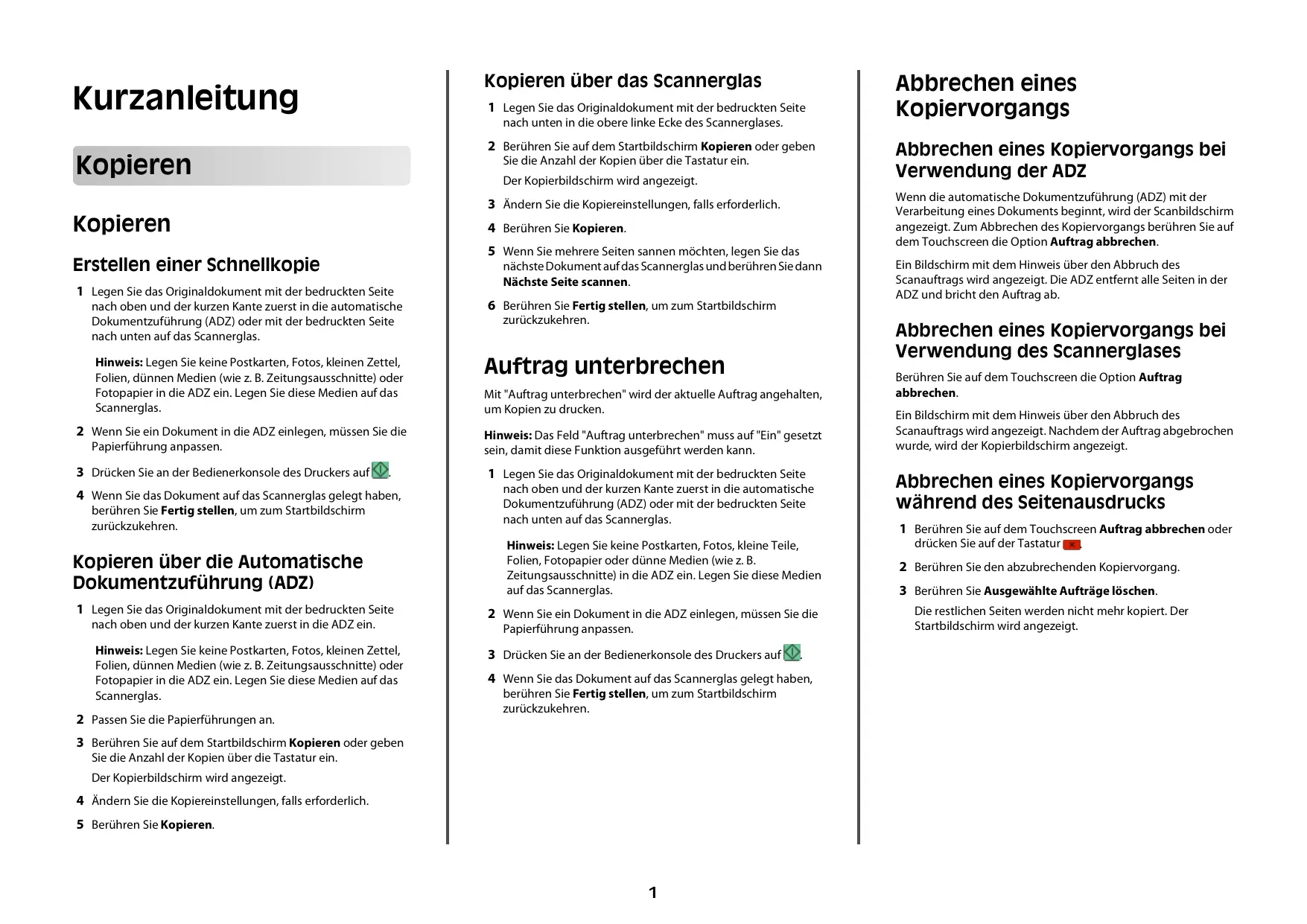 4 Wenn Sie das Dokument auf das Scannerglas gelegt haben, berühren Sie Fertig stellen, um zum Startbildschirm zurückzukehren. Abbrechen eines Kopiervorgangs Abbrechen eines Kopiervorgangs bei Verwendung der ADZ Wenn die automatische Dokumentzuführung (ADZ) mit der Verarbeitung eines Dokuments beginnt, wird der Scanbildschirm angezeigt. Zum Abbrechen des Kopiervorgangs berühren Sie auf dem Touchscreen die Option Auftrag abbrechen. Ein Bildschirm mit dem Hinweis über den Abbruch des Scanauftrags wird angezeigt. Die ADZ entfernt alle Seiten in der ADZ und bricht den Auftrag ab. Abbrechen eines Kopiervorgangs bei Verwendung des Scannerglases Berühren Sie auf dem Touchscreen die Option Auftrag abbrechen. Ein Bildschirm mit dem Hinweis über den Abbruch des Scanauftrags wird angezeigt. Nachdem der Auftrag abgebrochen wurde, wird der Kopierbildschirm angezeigt. Abbrechen eines Kopiervorgangs Während des Seitenausdrucks 1 Berühren Sie auf dem Touchscreen Auftrag abbrechen oder drücken Sie auf der Tastatur @B