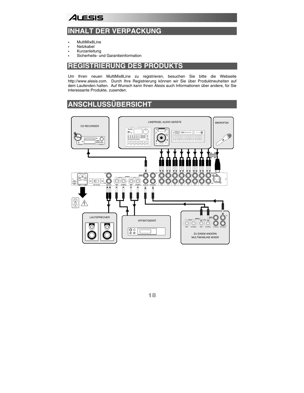 Um Ihren neuen MultiMix8Line zu registrieren, besuchen Sie bitte die Webseite http://www.alesis.com. Durch Ihre Registrierung können wir Sie über Produktneuheiten auf dem Laufenden halten. Auf Wunsch kann Ihnen Alesis auch Informationen über andere, für Sie interessante Produkte, zusenden. ANSCHLUSSÜBERSICHT