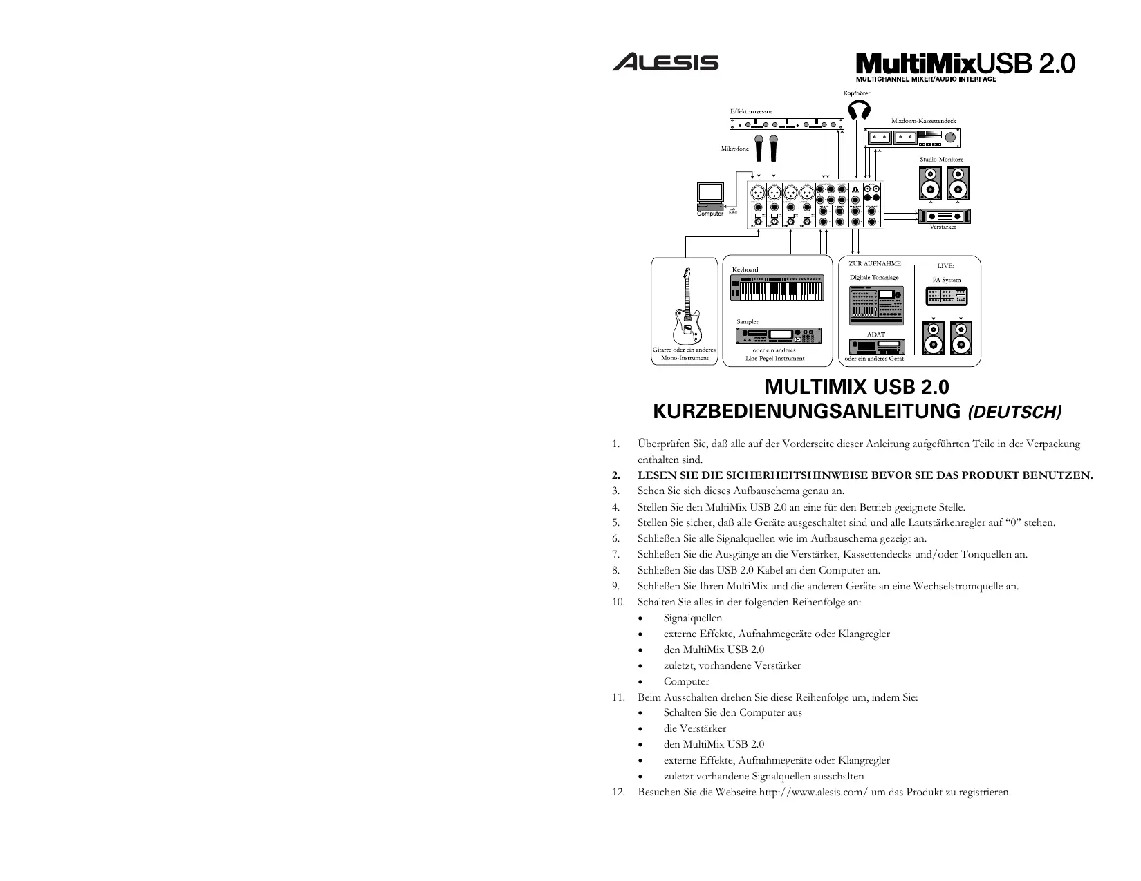 Überprüfen Sie, daß alle auf der Vorderseite dieser Anleitung aufgeführten Teile in der Verpackung enthalten sind. LESEN SIE DIE SICHERHEITSHINWEISE BEVOR SIE DAS PRODUKT BENUTZEN. Sehen Sie sich dieses Aufbauschema genau an. Stellen Sie den MultiMix USB 2.0 an eine für den Betrieb geeignete Stelle. Stellen Sie sicher, daß alle Geräte ausgeschaltet sind und alle Lautstärkenregler auf “0” stehen. Schließen Sie alle Signalquellen wie im Aufbauschema gezeigt an. Schließen Sie die Ausgänge an die Verstärker, Kassettendecks und/oder Tonquellen an. Schließen Sie das USB 2.0 Kabel an den Computer an. Schließen Sie Ihren MultiMix und die anderen Geräte an eine Wechselstromquelle an. Schalten Sie alles in der folgenden Reihenfolge an: Signalquellen externe Effekte, Aufnahmegeräte oder Klangregler den MultiMix USB 2.0 zuletzt, vorhandene Verstärker Computer Beim Ausschalten drehen Sie diese Reihenfolge um, indem Sie: Schalten Sie den Computer aus die Verstärker den MultiMix USB 2.0 externe Effekte, Aufnahmegeräte oder Klangregler zuletzt vorhandene Signalquellen ausschalten Besuchen Sie die Webseite http://www.alesis.com/ um das Produkt zu registrieren. BEDIENELEMENTE KANAL BEDIENELEMENTE MASTER Hinweis: Es wird empfohlen, den MULTIMIX vor dem Ein- oder Ausstecken jeglicher Quellen an den Eingängen des Geräts, auszuschalten. Schalten Sie auf keinen Fall nicht den MultiMix USB 2.0 aus, nachdem Sie eine Verbindung zum Computer hergestellt haben. MASTERBEREICH KANALLAUF