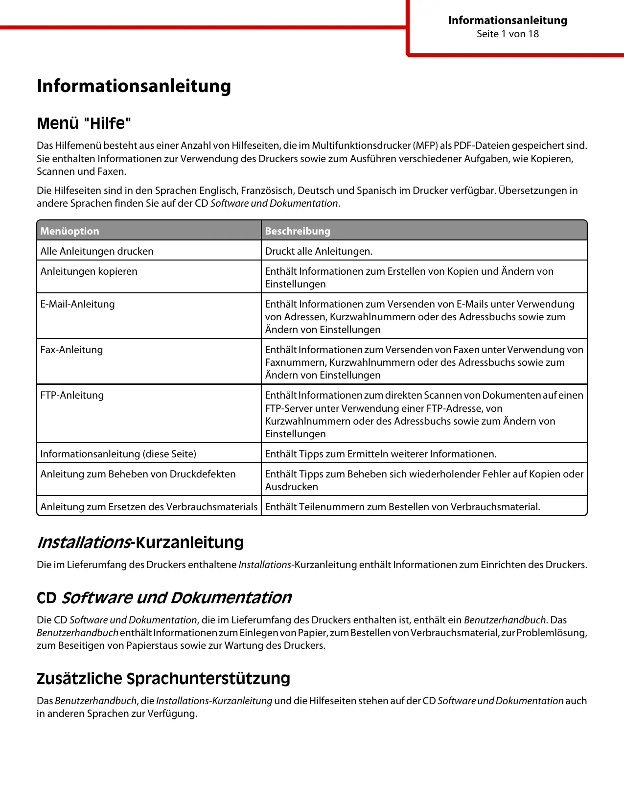 Informationsanleitung Menü "Hilfe" Informationsanleitung Seite 1 von 18 Das Hilfemenü besteht aus einer Anzahl von Hilfeseiten, die im Multifunktionsdrucker (MFP) als PDF-Dateien gespeichert sind. Sie enthalten Informationen zur Verwendung des Druckers sowie zum Ausführen verschiedener Aufgaben, wie Kopieren, Scannen und Faxen. Die Hilfeseiten sind in den Sprachen Englisch, Franzôsisch, Deutsch und Spanisch im Drucker verfügbar. Übersetzungen in andere Sprachen finden Sie auf der CD Software und Dokumentation. Menüoption | Beschreibung Alle Anleitungen drucken Druckt alle Anleitungen. Anleitungen kopieren Enthält Informationen zum Erstellen von Kopien und Ândern von Einstellungen E-Mail-Anleitung Enthält Informationen zum Versenden von E-Mails unter Verwendung von Adressen, Kurzwahinummern oder des Adressbuchs sowie zum Ândern von Einstellungen Fax-Anleitung Enthält Informationen zum Versenden von Faxen unter Verwendung von Faxnummern, Kurzwahlnummern oder des Adressbuchs sowie zum Ândern von Einstellungen FTP-Anleitung Enthält Informationen zum direkten Scannen von Dokumenten auf einen FTP-Server unter Verwendung einer FTP-Adresse, von Kurzwahlnummern oder des Adressbuchs sowie zum Ândern von Einstellungen Informationsanleitung (diese Seite) Enthält Tipps zum Ermitteln weiterer Informationen. Anleitung zum Beheben von Druckdefekten Enthält Tipps zum Beheben sich wiederholender Fehler auf Kopien oder Ausdrucken Anleitung zum Ersetzen des Verbrauchsmaterials Enthält Teilenummern zum Bestellen von Verbrauchsmaterial. Installations-Kurzanleitung Die im Lieferumfang des Druckers enthaltene /nstallations-Kurzanleitung enthält Informationen zum Einrichten des Druckers. CD Software und Dokumentation Die CD Software und Dokumentation, die im Lieferumfang des Druckers enthalten ist, enthält ein Benutzerhandbuch. Das Benutzerhandbuch enthält Informationen zum Einlegen von Papier, zum Bestellen von Verbrauchsmaterial,zurProblemlôsung, zum Beseitigen von Papierstaus sowie zur Wartung des Druckers. Zusätzliche Sprachunterstützung Das Benutzerhandbuch, die Installations-Kurzanleitung und die Hilfeseiten stehen auf der CD Software und Dokumentation auch in anderen Sprachen zur Verfügung.