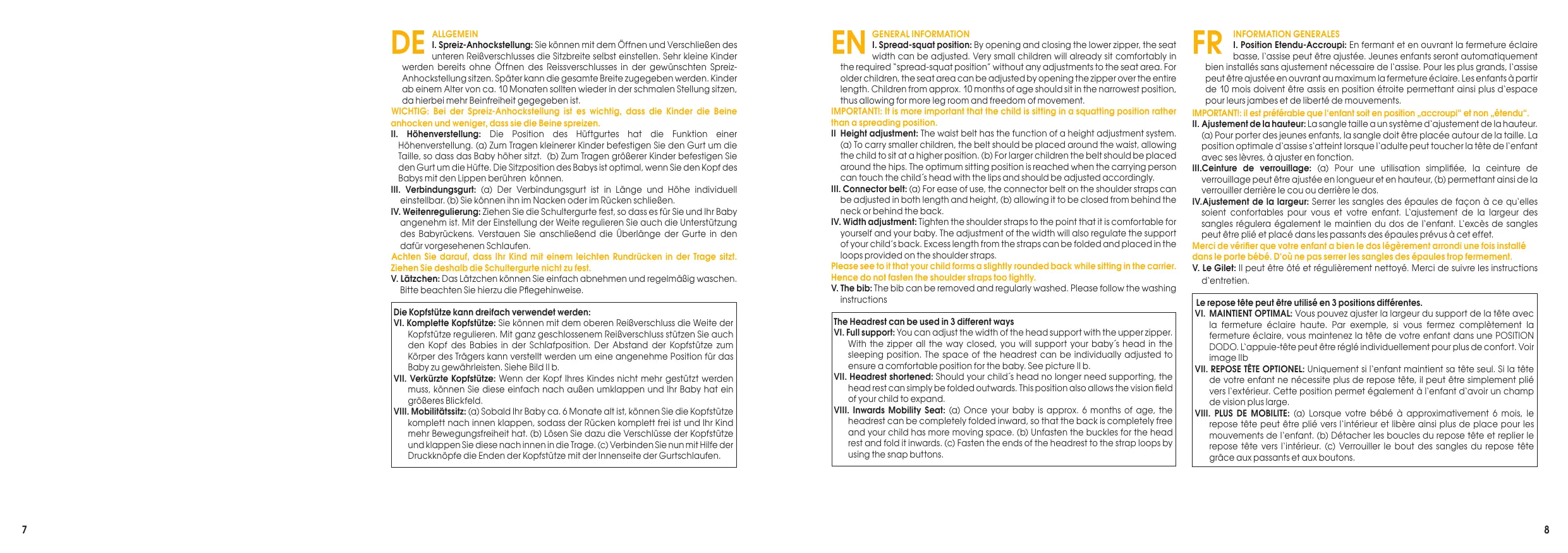 (a) Pour porter des jeunes enfants, la sangle doit être placée autour de la taille. La position optimale d‘assise s‘atteint lorsque l‘adulte peut toucher la tête de l‘enfant avec ses lèvres, à ajuster en fonction. III.Ceinture de verrouillage: (a) Pour une utilisation simplifiée, la ceinture de verrouillage peut être ajustée en longueur et en hauteur, (b) permettant ainsi de la verrouiller derrière le cou ou derrière le dos. IV.Ajustement de la largeur: Serrer les sangles des épaules de façon à ce qu‘elles soient confortables pour vous et votre enfant. L‘ajustement de la largeur des sangles régulera également le maintien du dos de l‘enfant. L‘excès de sangles peut être plié et placé dans les passants des épaules prévus à cet effet. Merci de vérifier que votre enfant a bien le dos légèrement arrondi une fois installé dans le porte bébé. D‘où ne pas serrer les sangles des épaules trop fermement. V. Le Gilet: Il peut être ôté et régulièrement nettoyé. Merci de suivre les instructions d‘entretien. Le repose tête peut être utilisé en 3 positions différentes. VI. MAINTIENT OPTIMAL: Vous pouvez ajuster la largeur du support de la tête avec la fermeture éclaire haute. Par exemple, si vous fermez complètement la fermeture éclaire, vous maintenez la tête de votre enfant dans une POSITION DODO. L‘appuie-tête peut être réglé individuellement pour plus de confort. Voir image IIb VII. REPOSE TÊTE OPTIONEL: Uniquement si l‘enfant maintient sa tête seul. Si la tête de votre enfant ne nécessite plus de repose tête, il peut être simplement plié vers l‘extérieur. Cette position permet également à l‘enfant d‘avoir un champ de vision plus large. VIII. PLUS DE MOBILITE: (a) Lorsque votre bébé à approximativement 6 mois, le repose tête peut être plié vers l‘intérieur et libère ainsi plus de place pour les mouvements de l‘enfant. (b) Détacher les boucles du repose tête et replier le repose tête vers l‘intérieur. (c) Verrouiller le bout des sangles du repose tête grâce aux passants et aux boutons.