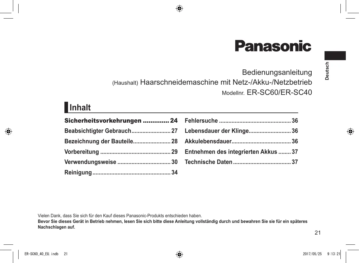 Finden Sie kostenlos die Bedienungsanleitung des Geräts ERSC60 PANASONIC als PDF.