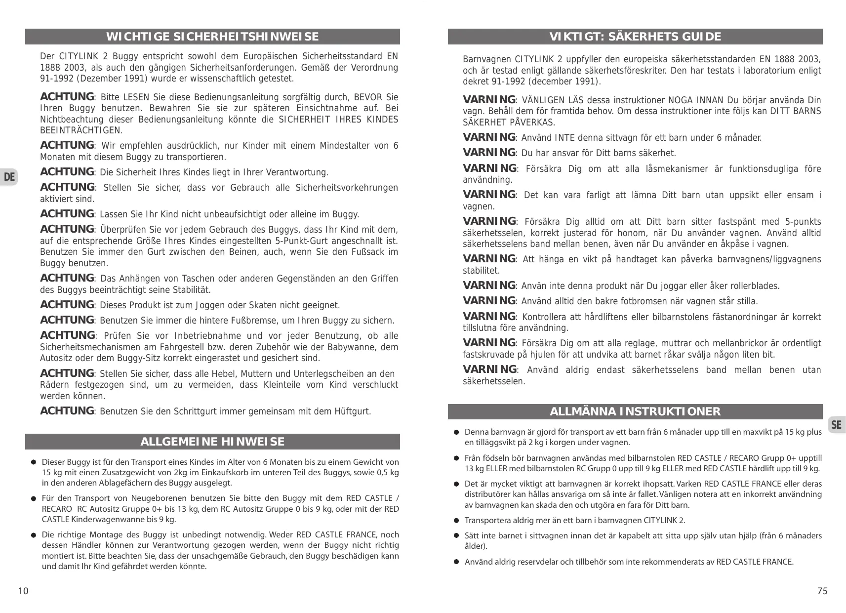 WICHTIGE SICHERHEITSHINWEISE Der CITYLINK 2 Buggy entspricht sowohl dem Europäischen Sicherheitsstandard EN 1888 2003, als auch den gängigen Sicherheitsanforderungen. Gemäß der Verordnung 91-1992 (Dezember 1991) wurde er wissenschaftlich getestet. Barnvagnen CITYLINK 2 uppfyller den europeiska säkerhetsstandarden EN 1888 2003, och är testad enligt gällande säkerhetsföreskriter. Den har testats i laboratorium enligt dekret 91-1992 (december 1991). ACHTUNG: Bitte LESEN Sie diese Bedienungsanleitung sorgfältig durch, BEVOR Sie Ihren Buggy benutzen. Bewahren Sie sie zur späteren Einsichtnahme auf. Bei Nichtbeachtung dieser Bedienungsanleitung könnte die SICHERHEIT IHRES KINDES BEEINTRÄCHTIGEN. VARNING: VÄNLIGEN LÄS dessa instruktioner NOGA INNAN Du börjar använda Din vagn. Behåll dem för framtida behov. Om dessa instruktioner inte följs kan DITT BARNS SÄKERHET PÅVERKAS. ACHTUNG: Wir empfehlen ausdrücklich, nur Kinder mit einem Mindestalter von 6 Monaten mit diesem Buggy zu transportieren. ACHTUNG: Die Sicherheit Ihres Kindes liegt in Ihrer Verantwortung. ACHTUNG: Stellen Sie sicher, dass vor Gebrauch alle Sicherheitsvorkehrungen