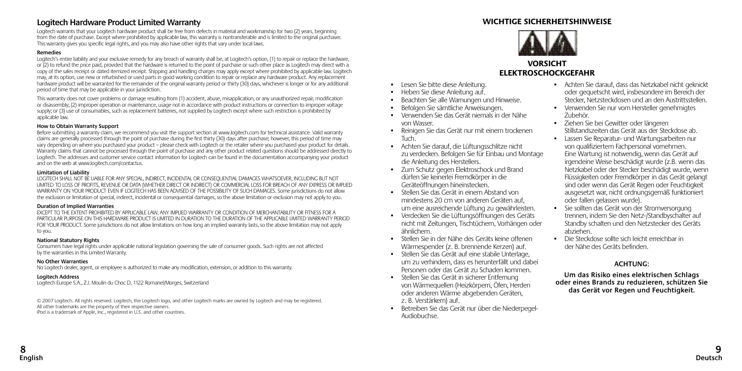 Adresse von Logitech Logitech Europe S.A., Z.I. Moulin du Choc D, 1122 Romanel/Morges, Schweiz ©2007 Logitech. Alle Rechte vorbehalten. Logitech, das Logitech-Logo und andere Logitech-Marken sind Eigentum von Logitech und ggf. eingetragen. Alle anderen Marken sind das Eigentum ihrer jeweiligen Inhaber. iPod ist eine in den USA und anderen Ländern eingetragene Marke von Apple, Inc.
