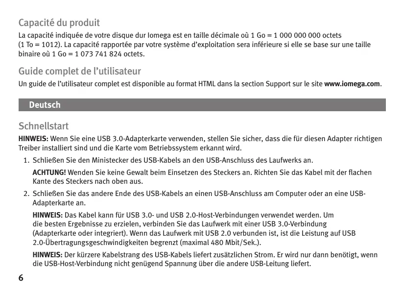 Capacité du produit La capacité indiquée de votre disque dur Iomega est en taille décimale où 1 Go = 1 000 000 000 octets (1 To = 1012). La capacité rapportée par votre système d’exploitation sera inférieure si elle se base sur une taille binaire où 1 Go = 1 073 741 824 octets. Guide complet de l’utilisateur Un guide de l’utilisateur complet est disponible au format HTML dans la section Support sur le site www.iomega.com. Schnellstart HINWEIS: Wenn Sie eine USB 3.0-Adapterkarte verwenden, stellen Sie sicher, dass die für diesen Adapter richtigen Treiber installiert sind und die Karte vom Betriebssystem erkannt wird.