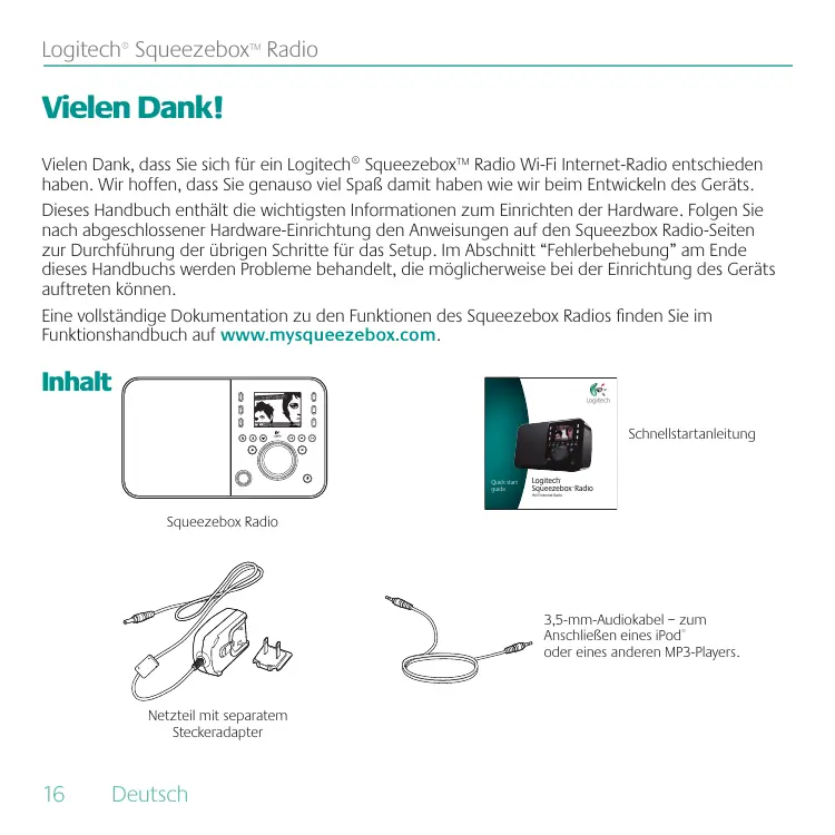 Logitech® Squeezebox™ Radio Vielen Dank! Vielen Dank, dass Sie sich für ein Logitech® Squeezebox™ Radio Wi-Fi Internet-Radio entschieden haben. Wir hoffen, dass Sie genauso viel Spaß damit haben wie wir beim Entwickeln des Geräts. Dieses Handbuch enthält die wichtigsten Informationen zum Einrichten der Hardware. Folgen Sie nach abgeschlossener Hardware-Einrichtung den Anweisungen auf den Squeezbox Radio-Seiten zur Durchführung der übrigen Schritte für das Setup. Im Abschnitt “Fehlerbehebung” am Ende dieses Handbuchs werden Probleme behandelt, die möglicherweise bei der Einrichtung des Geräts auftreten können. Eine vollständige Dokumentation zu den Funktionen des Squeezebox Radios finden Sie im Funktionshandbuch auf www.mysqueezebox.com. Inhalt