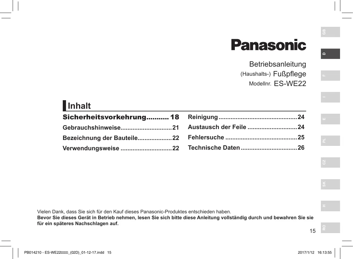 Finden Sie kostenlos die Bedienungsanleitung des Geräts ESWE22 PANASONIC als PDF.