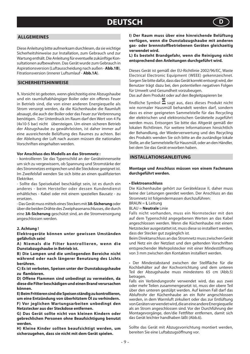 These Anleitungitte aufmerksam durchlesen, da sie wichtige Sicherheitshinweise zur Installation, zum Gebrauch und zur Wartung enthalt. Die Anleitung fur eventuelle zukünftige Konsultationen aufbewahren. Das Gerät wurde zum Gebrauch in Aspirationsversion (Luftausscheidung nach außen - Abb.1B), Fritationsversion (innerer Luftumlauf - Abb.1A).