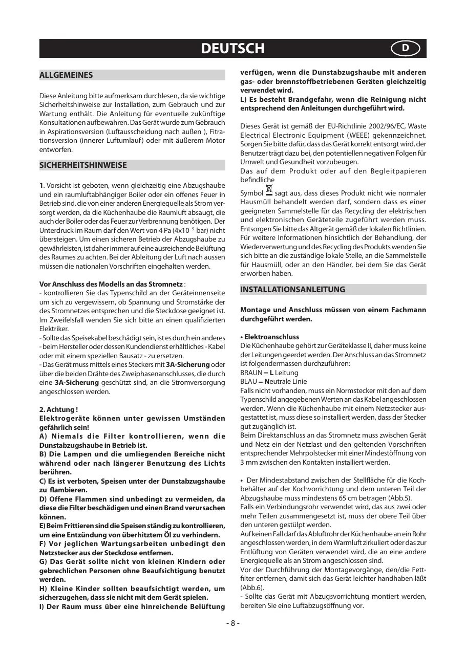 verfügen, wenn die Dunstabzugshaube mit anderen gas- oder brennstoffbetriebenen Geräten gleichzeitig verwendet wird. L) Es besteht Brandgefahr, wenn die Reinigung nicht entsprechend den Anleitungen durchgeführt wird. ALLGEMEINES Diese Anleitung bitte aufmerksam durchlesen, da sie wichtige Sicherheitshinweise zur Installation, zum Gebrauch und zur Wartung enthält. Die Anleitung für eventuelle zukünftige Konsultationen aufbewahren. Das Gerät wurde zum Gebrauch in Aspirationsversion (Luftausscheidung nach außen ), Fitrationsversion (innerer Luftumlauf ) oder mit äußerem Motor entworfen. Dieses Gerät ist gemäß der EU-Richtlinie 2002/96/EC, Waste Electrical Electronic Equipment (WEEE) gekennzeichnet. Sorgen Sie bitte dafür, dass das Gerät korrekt entsorgt wird, der Benutzer trägt dazu bei, den potentiellen negativen Folgen für Umwelt und Gesundheit vorzubeugen. Das auf dem Produkt oder auf den Begleitpapieren befindliche SICHERHEITSHINWEISE