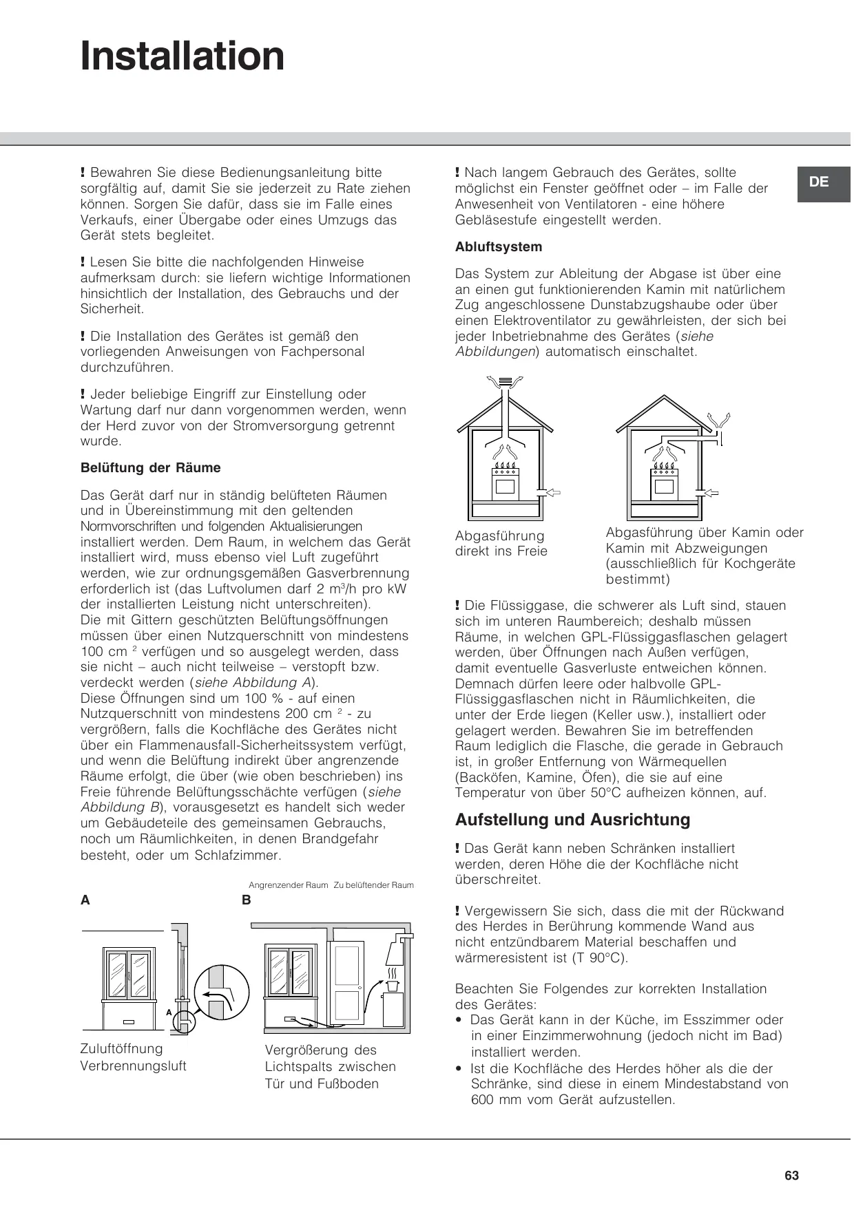 Abluftsystem Das System zur Ableitung der Abgase ist über eine an einen gut funktionierenden Kamin mit natürlichem Zug angeschlossene Dunstabzugshaube oder über einen Elektroventilator zu gewährleisten, der sich bei jeder Inbetriebnahme des Gerätes (siehe Abbildungen) automatisch einschaltet. ! Jeder beliebige Eingriff zur Einstellung oder Wartung darf nur dann vorgenommen werden, wenn der Herd zuvor von der Stromversorgung getrennt wurde. Belüftung der Räume Das Gerät darf nur in ständig belüfteten Räumen und in Übereinstimmung mit den geltenden Normvorschriften und folgenden Aktualisierungen installiert werden. Dem Raum, in welchem das Gerät installiert wird, muss ebenso viel Luft zugeführt werden, wie zur ordnungsgemäßen Gasverbrennung erforderlich ist (das Luftvolumen darf 2 m3/h pro kW der installierten Leistung nicht unterschreiten). Die mit Gittern geschützten Belüftungsöffnungen müssen über einen Nutzquerschnitt von mindestens 100 cm 2 verfügen und so ausgelegt werden, dass sie nicht – auch nicht teilweise – verstopft bzw. verdeckt werden (siehe Abbildung A). Diese Öffnungen sind um 100 % - auf einen Nutzquerschnitt von mindestens 200 cm 2 - zu vergrößern, falls die Kochfläche des Gerätes nicht über ein Flammenausfall-Sicherheitssystem verfügt, und wenn die Belüftung indirekt über angrenzende Räume erfolgt, die über (wie oben beschrieben) ins Freie führende Belüftungsschächte verfügen (siehe Abbildung B), vorausgesetzt es handelt sich weder um Gebäudeteile des gemeinsamen Gebrauchs, noch um Räumlichkeiten, in denen Brandgefahr besteht, oder um Schlafzimmer. Angrenzender Raum Zu belüftender Raum