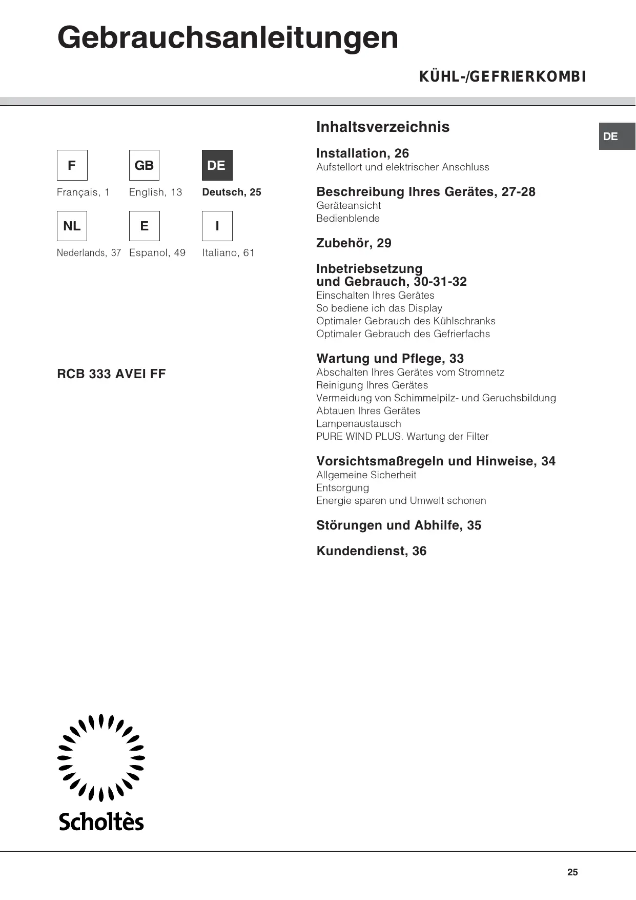Finden Sie kostenlos die Bedienungsanleitung des Geräts RCB 333 AVEI FF SCHOLTES als PDF.