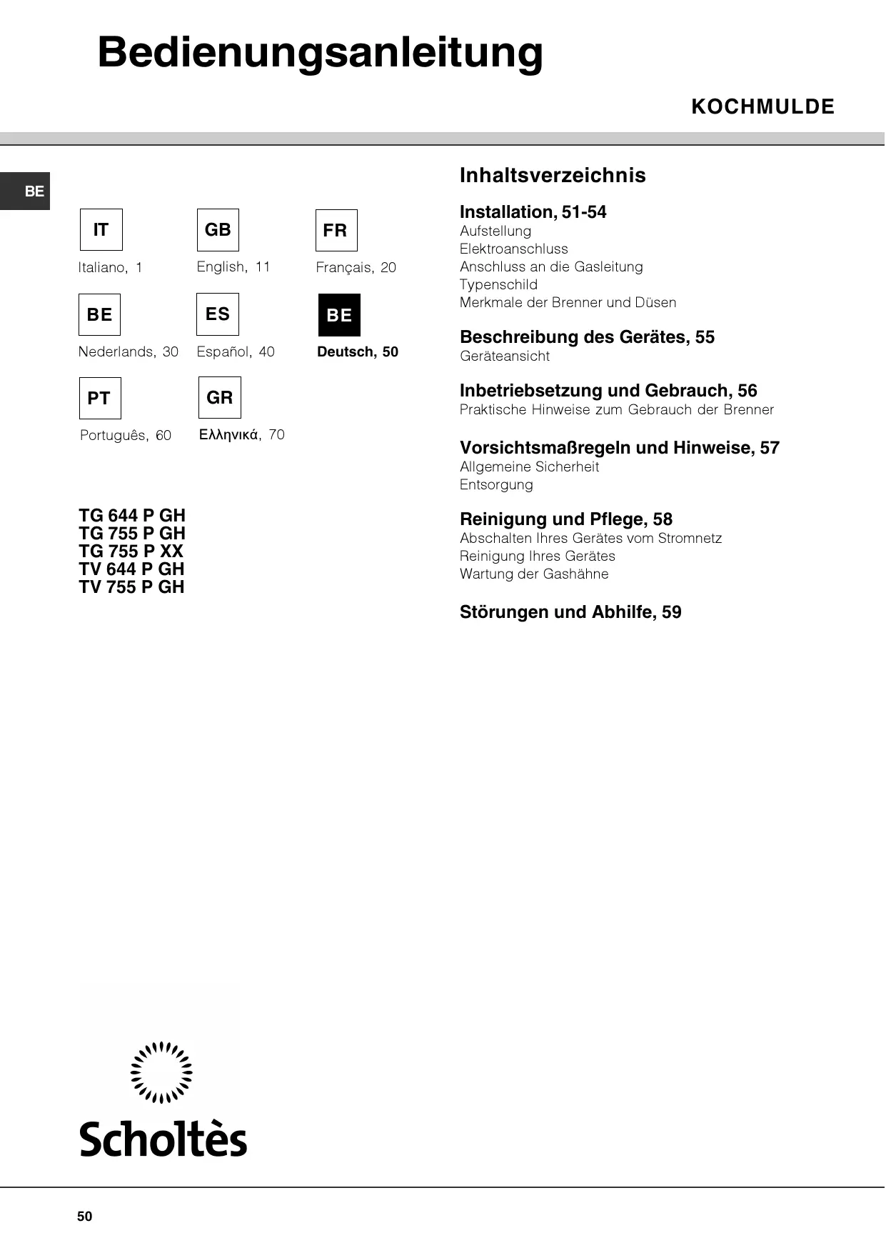 Deutsch, 50 Aufstellung Elektroanschluss Anschluss an die Gasleitung Typenschild Merkmale der Brenner und Düsen Beschreibung des Gerätes, 55 Geräteansicht Inbetriebsetzung und Gebrauch, 56 Praktische Hinweise zum Gebrauch der Brenner Vorsichtsmaßregeln und Hinweise, 57 Allgemeine Sicherheit Entsorgung TG 644 P GH TG 755 P GH TG 755 P XX TV 644 P GH TV 755 P GH Reinigung und Pflege, 58 Abschalten Ihres Gerätes vom Stromnetz Reinigung Ihres Gerätes Wartung der Gashähne Störungen und Abhilfe, 59