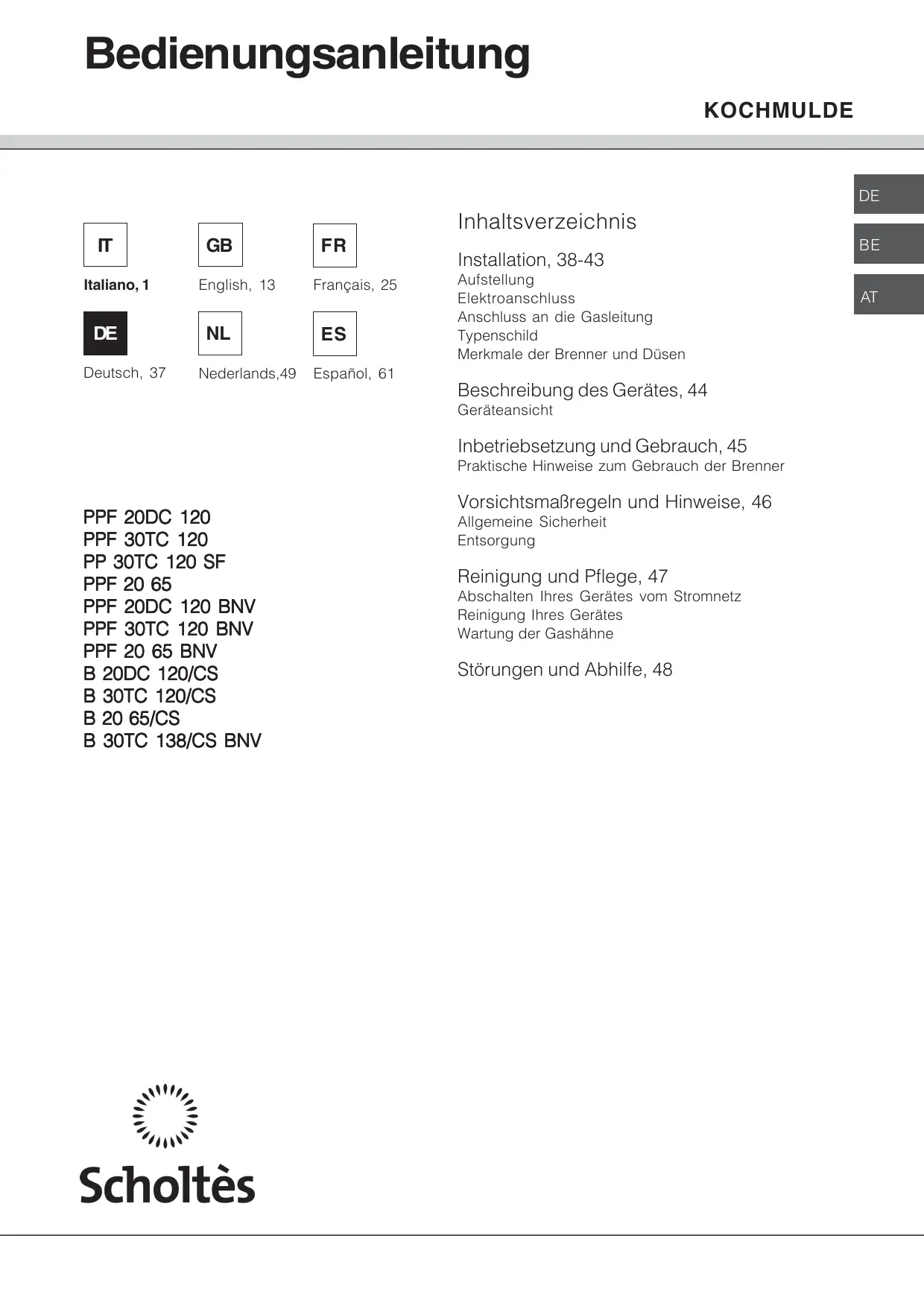 Español, 61 Installation, 38-43 Aufstellung Elektroanschluss Anschluss an die Gasleitung Typenschild Merkmale der Brenner und Düsen Beschreibung des Gerätes, 44 Geräteansicht Inbetriebsetzung und Gebrauch, 45 Praktische Hinweise zum Gebrauch der Brenner PPF 20DC 120 PPF 30TC 120 PP 30TC 120 SF PPF 20 65