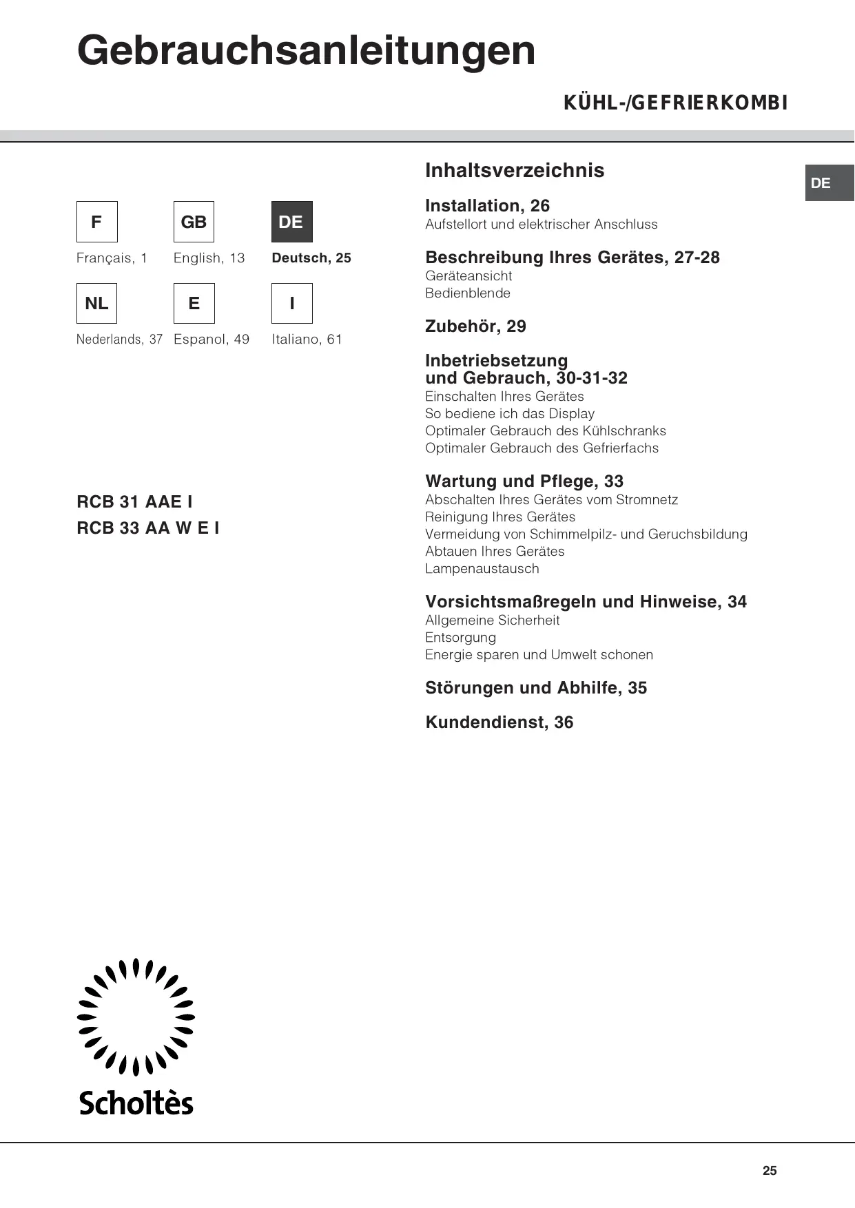 Finden Sie kostenlos die Bedienungsanleitung des Geräts RCB 31 AAE I SCHOLTES als PDF.