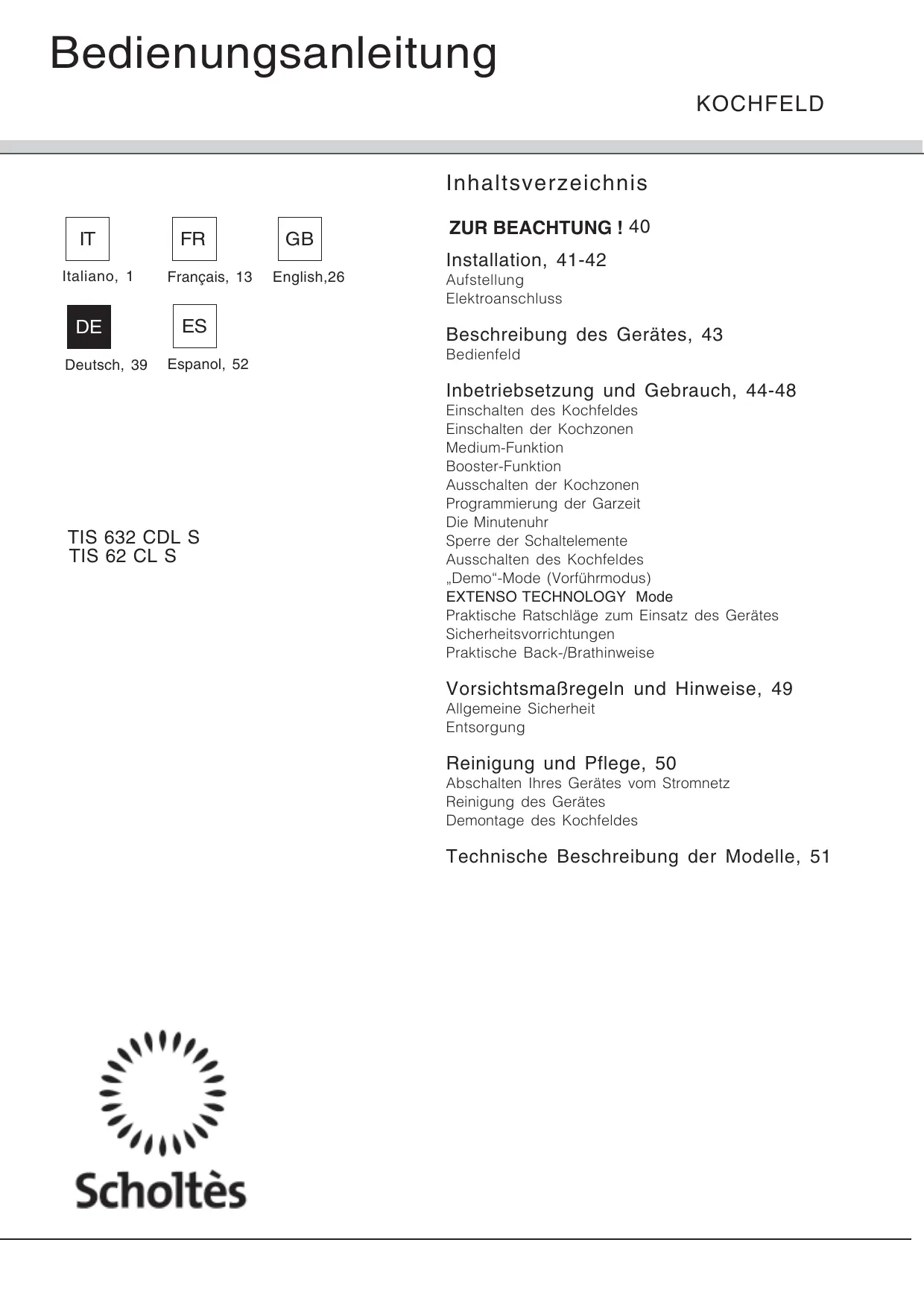TIS 632 CD L S - Kochfeld SCHOLTES - Kostenlose Bedienungsanleitung