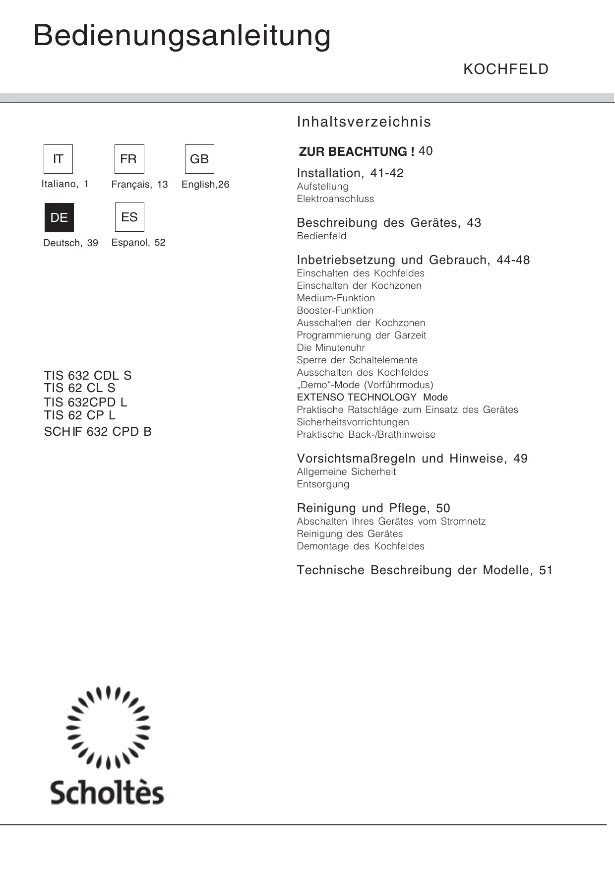 Laden Sie die Anleitung für Ihr Kochfeld kostenlos im PDF-Format! Finden Sie Ihr Handbuch SCH IF 632 CPD B - SCHOLTES und nehmen Sie Ihr elektronisches Gerät wieder in die Hand. Auf dieser Seite sind alle Dokumente veröffentlicht, die für die Verwendung Ihres Geräts notwendig sind. SCH IF 632 CPD B von der Marke SCHOLTES.