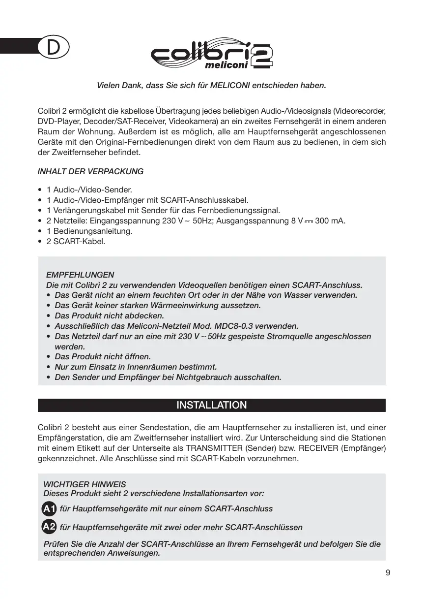 Vielen Dank, dass Sie sich für MELICONI entschieden haben. Colibrì 2 ermöglicht die kabellose Übertragung jedes beliebigen Audio-/Videosignals (Videorecorder, DVD-Player, Decoder/SAT-Receiver, Videokamera) an ein zweites Fernsehgerät in einem anderen Raum der Wohnung. Außerdem ist es möglich, alle am Hauptfernsehgerät angeschlossenen Geräte mit den Original-Fernbedienungen direkt von dem Raum aus zu bedienen, in dem sich der Zweitfernseher befindet.