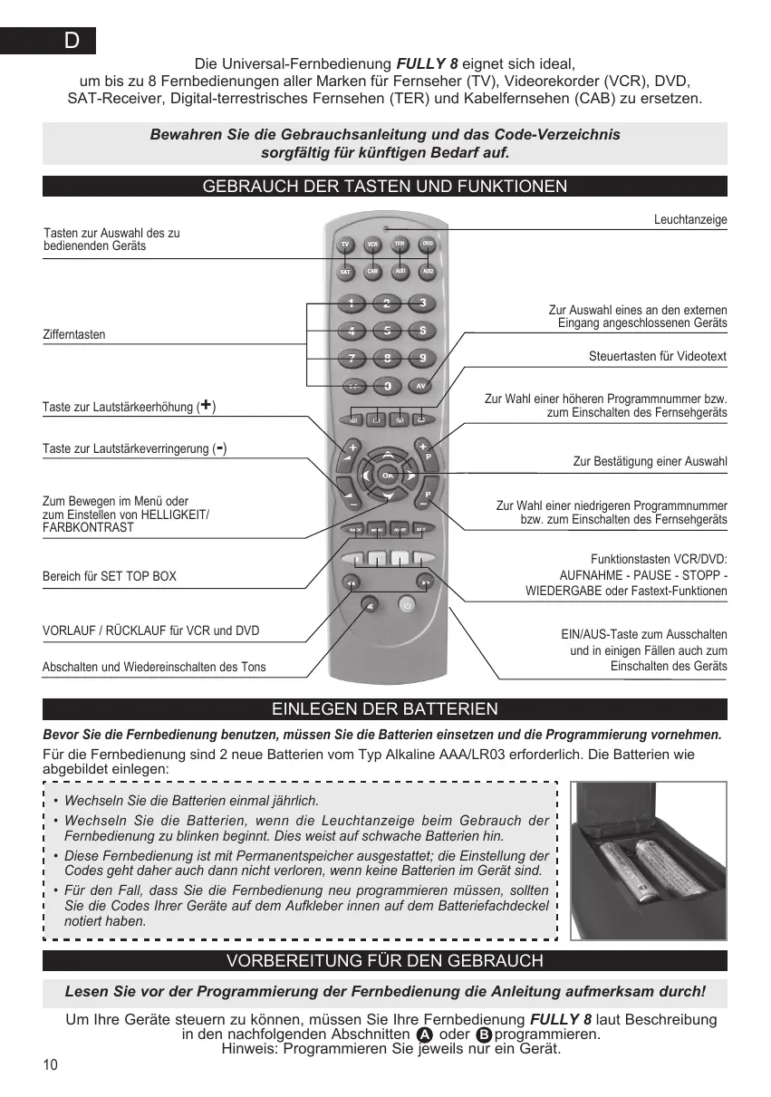 Die Universal-Fernbedienung FULLY 8 eignet sich ideal, um bis zu 8 Fernbedienungen aller Marken für Fernseher (TV), Videorekorder (VCR), DVD, SAT-Receiver, Digital-terrestrisches Fernsehen (TER) und Kabelfernsehen (CAB) zu ersetzen. Bewahren Sie die Gebrauchsanleitung und das Code-Verzeichnis sorgfältig für künftigen Bedarf auf.