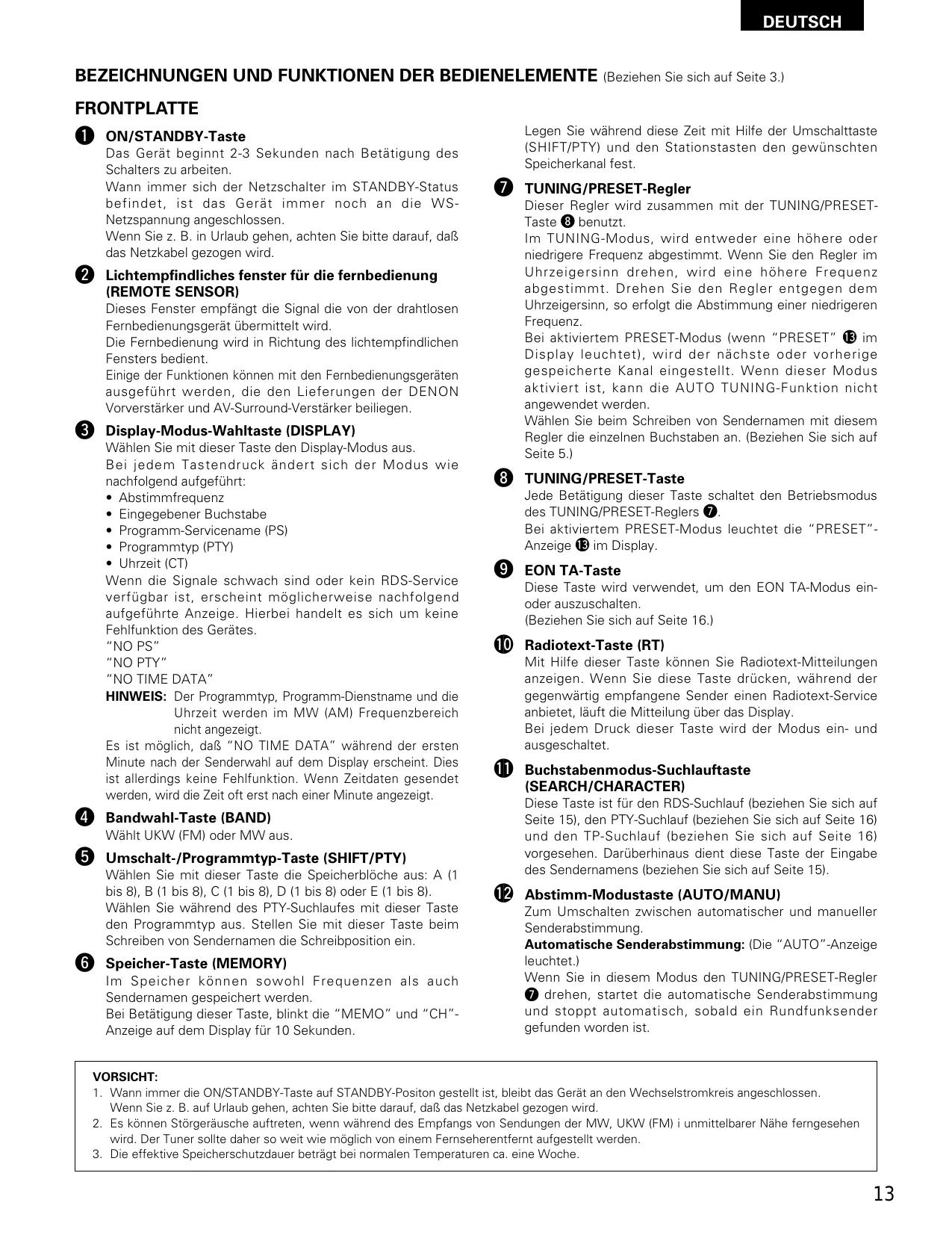 VORSICHT: 1. Wann immer die ON/STANDBY-Taste auf STANDBY-Positon gestellt ist, bleibt das Gerät an den Wechselstromkreis angeschlossen. Wenn Sie z. B. auf Urlaub gehen, achten Sie bitte darauf, daß das Netzkabel gezogen wird. 2. Es können Störgeräusche auftreten, wenn während des Empfangs von Sendungen der MW, UKW (FM) i unmittelbarer Nähe ferngesehen wird. Der Tuner sollte daher so weit wie möglich von einem Fernseherentfernt aufgestellt werden. 3. Die effektive Speicherschutzdauer beträgt bei normalen Temperaturen ca. eine Woche.