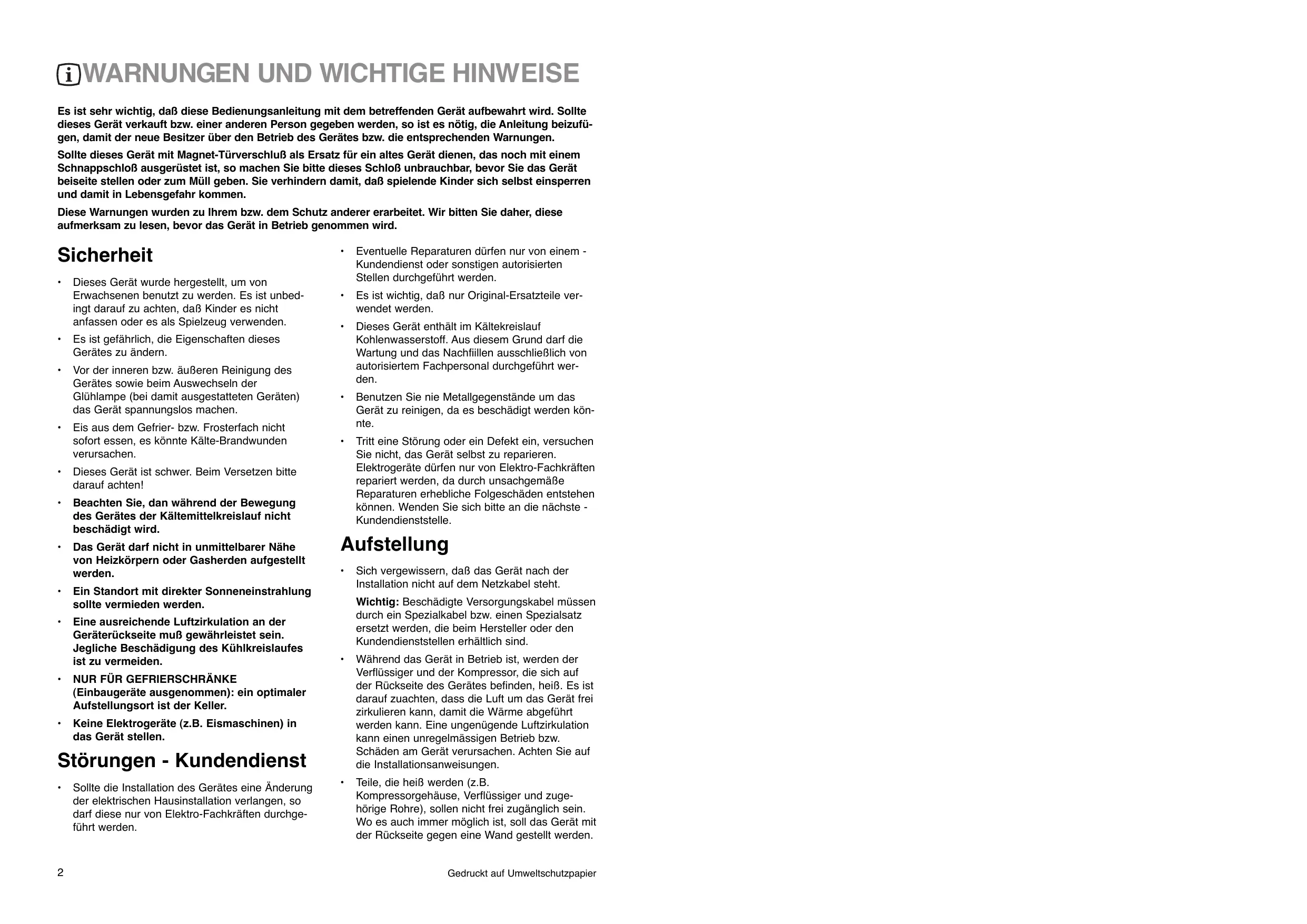 Teile, die hei§ werden (z.B. KompressorgehŠuse, VerflŸssiger und zugehšrige Rohre), sollen nicht frei zugŠnglich sein. Wo es auch immer mšglich ist, soll das GerŠt mit der RŸckseite gegen eine Wand gestellt werden. Stšrungen - Kundendienst