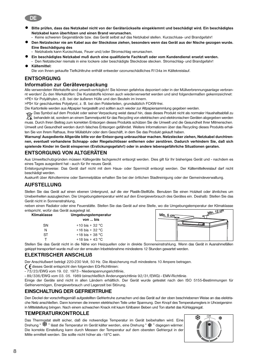 AUFSTELLUNG Stellen Sie das Gerät auf einen ebenen Untergrund, auf die vier Plastik-Stellfüße. Benutzen Sie einen Holzkeil oder ähnliches um Unebenheiten auszugleichen. Die Umgebungstemperatur wirkt auf den Energieverbrauch des Gerätes ein. Deshalb: Stellen Sie das Gerät nicht in Sonnenstrahlung, neben einen Radiator oder eine Feuerstätte. Stellen Sie das Gerät auf eine Stelle, wo die Umgebungstemperatur der Klimaklasse entspricht, wofür das Gerät ausgelegt ist. Klimaklasse Umgebungstemperatur von ... bis SN +10 bis + 32 °C N +16 bis + 32 °C ST +18 bis + 38 °C T +18 bis + 43 °C Stellen Sie das Gerät nicht in die Nähe von Heizquellen oder in direkte Sonneneinstrahlung. Wenn das Gerät in Ausnahmefällen gekippt transportiert wurde muß vor der erneuten Inbetriebnahme mindestens 12 Stunden gewartet werden.