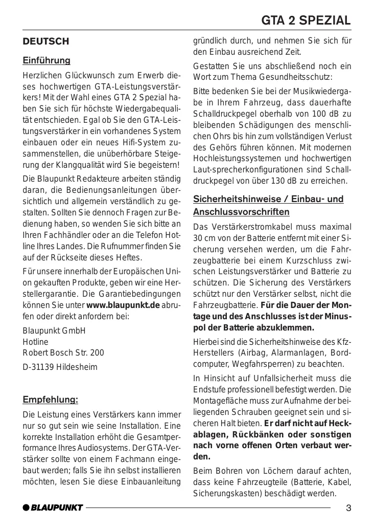 GTA 2 SPEZIAL ENGLISH INTRODUCTION Congratulations on your purchase of a highquality GTA power amplifier. By selecting the GTA 2 Spezial you have chosen a product which delivers superlative reproduction quality. Whether you are upgrading an existing system or using the GTA power amplifier in a new system, you are certain to notice immediate performance benefits! The Blaupunkt editors are constantly working on making the operating instructions clearer and easier to understand. However, if you still have any questions on how to operate the equipment, please contact your dealer or the telephone hotline for your country. You will find the hotline telephone numbers printed at the back of this booklet. We provide a manufacturer guarantee for our products bought within the European Union. You can view the guarantee conditions at www.blaupunkt.de or ask for them directly at: Blaupunkt GmbH Hotline Robert-Bosch-Str. 200 D-31139 Hildesheim Germany