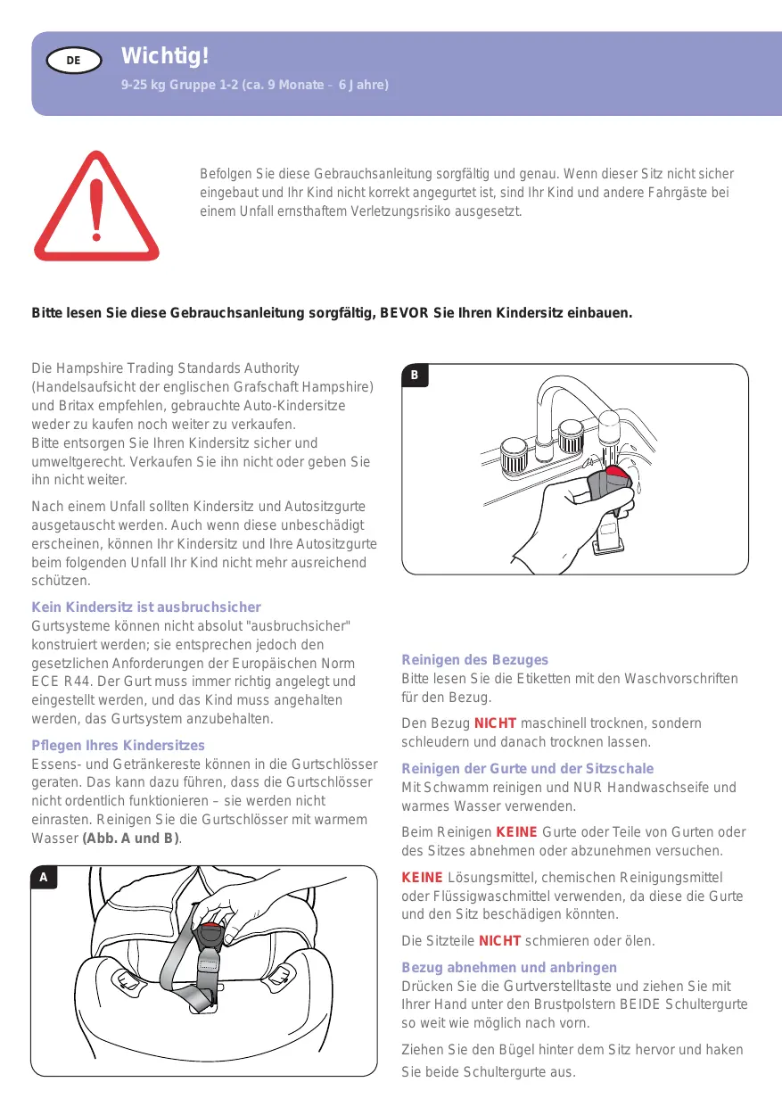 B Nach einem Unfall sollten Kindersitz und Autositzgurte ausgetauscht werden. Auch wenn diese unbeschädigt erscheinen, können Ihr Kindersitz und Ihre Autositzgurte beim folgenden Unfall Ihr Kind nicht mehr ausreichend schützen. Kein Kindersitz ist ausbruchsicher Gurtsysteme können nicht absolut "ausbruchsicher" konstruiert werden; sie entsprechen jedoch den gesetzlichen Anforderungen der Europäischen Norm ECE R44. Der Gurt muss immer richtig angelegt und eingestellt werden, und das Kind muss angehalten werden, das Gurtsystem anzubehalten. Pflegen Ihres Kindersitzes Essens- und Getränkereste können in die Gurtschlösser geraten. Das kann dazu führen, dass die Gurtschlösser nicht ordentlich funktionieren – sie werden nicht einrasten. Reinigen Sie die Gurtschlösser mit warmem Wasser (Abb. A und B).