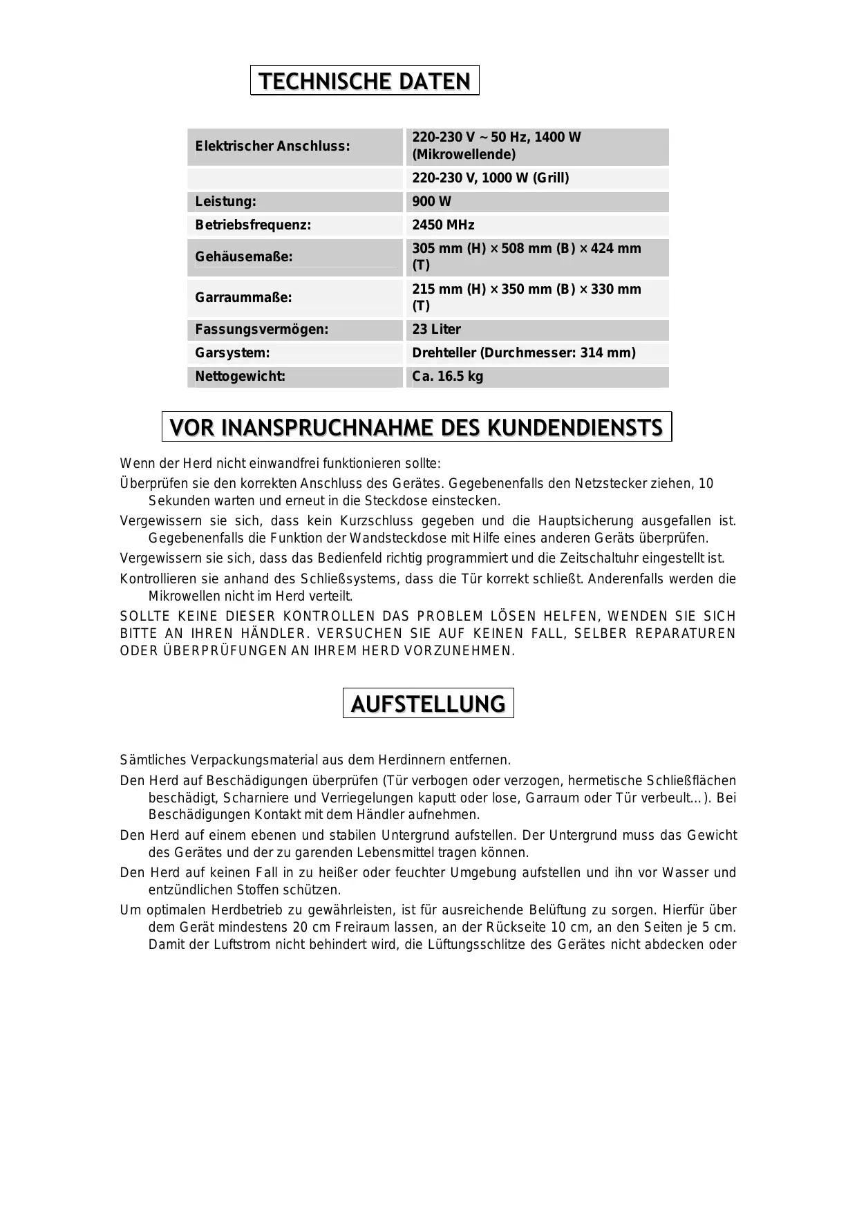 TECHNISCHE DATEN Elektrischer Anschluss: 220-230 V ~ 50 Hz, 1400 W (Mikrowellende) 220-230 V, 1000 W (Grill) Leistung: 900 W Betriebsfrequenz: 2450 MHz Gehäusemaße: 305 mm (H) × 508 mm (B) × 424 mm (T) Garraummaße: 215 mm (H) × 350 mm (B) × 330 mm (T) Fassungsvermögen: 23 Liter Garsystem: Drehteller (Durchmesser: 314 mm) Nettogewicht: Ca. 16.5 kg