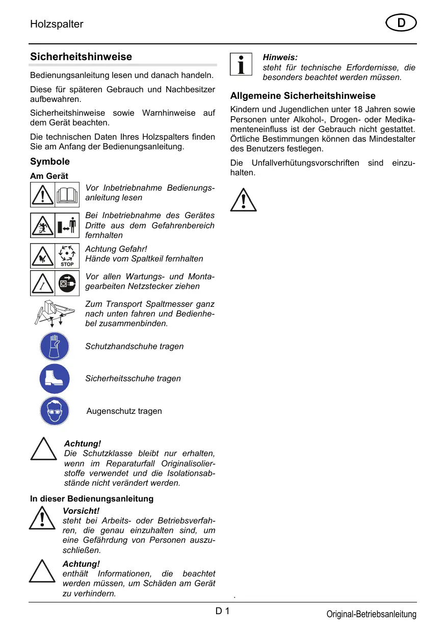 Pe aparat Înainte de punerea în funcţiune, se vor citi instrucţiunile de utilizare întreţinere şi montaj, se scoate fişa de reţea Pentru transport, se deplasează cuţitului de despicare complet în jos şi se leagă între ele manetele de operare. Se vor purta mânuşi de protecţie Se va purta protecţie