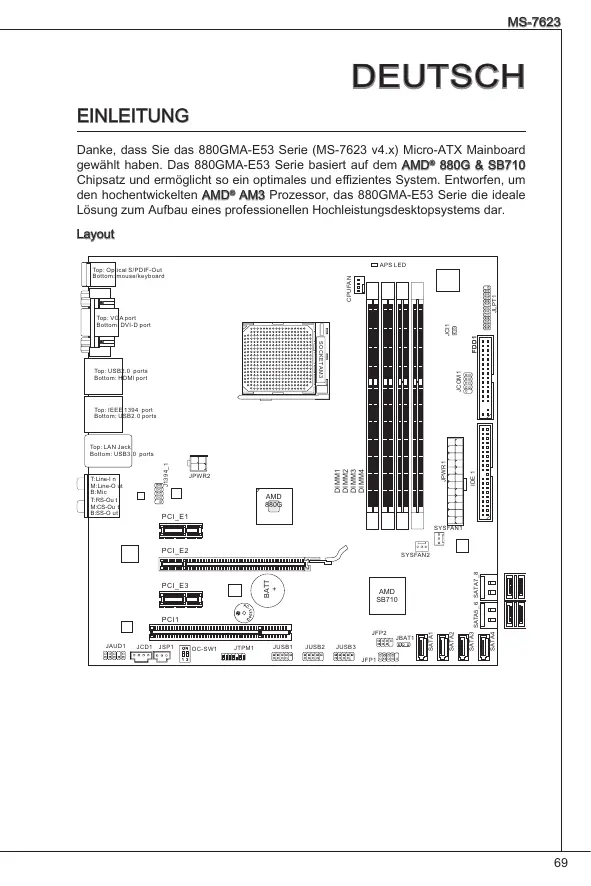 MS-7623 Deutsch eINLEITUNG Danke, dass Sie das 880GMA-E53 Serie (MS-7623 v4.x) Micro-ATX Mainboard gewählt haben. Das 880GMA-E53 Serie basiert auf dem AMD® 880G & SB710 Chipsatz und ermöglicht so ein optimales und effizientes System. Entworfen, um den hochentwickelten AMD® AM3 Prozessor, das 880GMA-E53 Serie die ideale Lösung zum Aufbau eines professionellen Hochleistungsdesktopsystems dar. Layout APS LED JLPT1 CPUFAN Top: Optical S/PDIF-Out Bottom: mouse/keyboard JCOM1 SOCKET AM3 Top: USB2.0 ports Bottom: HDMI port FDD1 JCI1 Top: VGA port Bottom: DVI-D port Top: IEEE 1394 port Bottom: USB2.0 ports JPWR1 JPWR2 AMD 880G IDE 1 T: Line-I n M: Line-O ut B: Mic T:RS-Ou t M:CS-Ou t B:SS-O ut DIMM1 DIMM2 DIMM3 DIMM4 J1394_1 Top: LAN Jack Bottom: USB3.0 ports PCI_E1 SYSFAN1 PCI_E2 SATA5_6 SATA7_8 AMD SB710 JCD1 JSP1 OC-SW1 JTPM1 JUSB1 JUSB2 JUSB3 JBAT1 SATA2 JFP2 JAUD1 SATA1 PCI1 SATA4 PCI_E3 SATA3 BATT