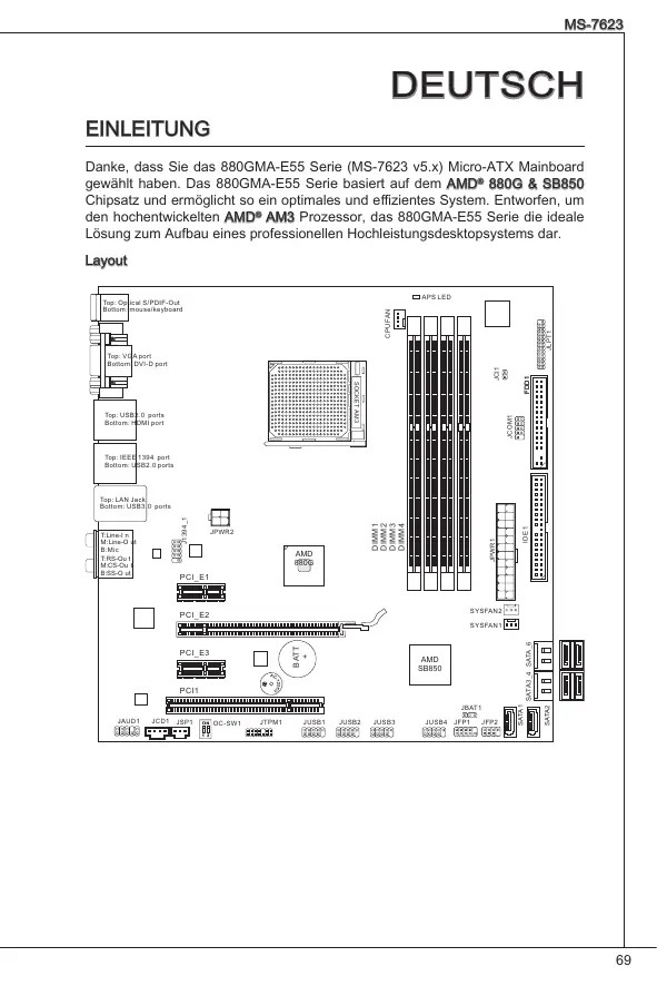 MS-7623 Deutsch eINLEITUNG Danke, dass Sie das 880GMA-E55 Serie (MS-7623 v5.x) Micro-ATX Mainboard gewählt haben. Das 880GMA-E55 Serie basiert auf dem AMD® 880G & SB850 Chipsatz und ermöglicht so ein optimales und effizientes System. Entworfen, um den hochentwickelten AMD® AM3 Prozessor, das 880GMA-E55 Serie die ideale Lösung zum Aufbau eines professionellen Hochleistungsdesktopsystems dar. Layout APS LED JLPT1 CPUFAN Top: Optical S/PDIF-Out Bottom: mouse/keyboard JCOM1 SOCKET AM3 Top: USB2.0 ports Bottom: HDMI port FDD1 JCI1 Top: VGA port Bottom: DVI-D port Top: IEEE 1394 port Bottom: USB2.0 ports AMD 880G IDE 1 JPWR2 JPWR1 T: Line-I n M: Line-O ut B: Mic T:RS-Ou t M:CS-Ou t B:SS-O ut DIMM1 DIMM2 DIMM3 DIMM4 J1394_1 Top: LAN Jack Bottom: USB3.0 ports PCI_E1 SYSFAN2 PCI_E2 SATA3_4 SATA_6 JBAT1 JAUD1 JCD1 JSP1 OC-SW1 JTPM1 JUSB1 JUSB2 JUSB3 JUSB4 JFP1 JFP2 SATA2 AMD SB850 PCI1 SATA1 BATT