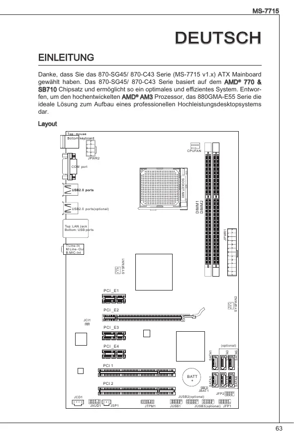 MS-7715 Deutsch eINLEITUNG Danke, dass Sie das 870-SG45/ 870-C43 Serie (MS-7715 v1.x) ATX Mainboard gewählt haben. Das 870-SG45/ 870-C43 Serie basiert auf dem AMD® 770 & SB710 Chipsatz und ermöglicht so ein optimales und effizientes System. Entworfen, um den hochentwickelten AMD® AM3 Prozessor, das 880GMA-E55 Serie die ideale Lösung zum Aufbau eines professionellen Hochleistungsdesktopsystems dar. Layout CPUFAN JPWR2 COM port SOCKET AM3 DIMM1 DIMM2 USB2.0 ports USB2.0 ports(optional) JPWR1 Top: LAN Jack Bottom: USB ports SYSFAN1 T:Line-In M:Line- Out B:MIC-Int SYSFAN2 PCI _E1 PCI _E2 JCI1 PCI _E3 SATA3 SATA5 SATA6 SATA1 SATA4 (optional) PCI _E4 PCI 1 SATA2 BATT