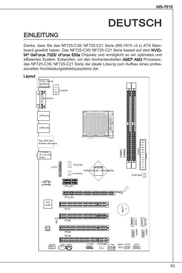 Denke, dass Sie das NF725-C35/ NF725-C21 Serie (MS-7615 v2.x) ATX Mainboard gewährt haben. Das NF725-C35/ NF725-C21 Serie basiert auf dem NVIDIA® GeForce 7025/ nForce 630a Chipsatz und ermöglicht so ein optimes und effizientes System. Entworfen, um den hochentwickelten AMD® AM3 Prozessor, das NF725-C35/ NF725-C21 Serie die ideale Lösung zum Aufbau eines professionellen Hochleistungsdesketchopsystems dar.