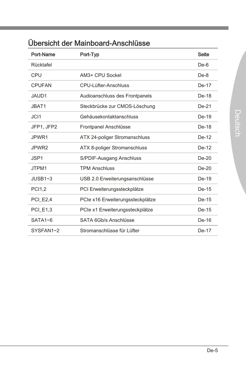 - SATA-Kabel haben identische Stecker an beiden Enden. Es wird empfohlen den flachen Stecker auf dem Mainboard einstecken. De-16 CPUFAN,SYSFAN1~2: Stromanschlüsse für Lüfter Die Anschlüsse unterstützen aktive Systemlüfter mit +12V. Ist Ihr Mainboard mit einem Chipsatz zur Überwachung der Systemhardware versehen, dann brauchen Sie einen speziellen Lüfter mit Geschwindigkeitsregelung, um die Vorteile der Steuerung des CPU Lüfters zu nutzen. Vergessen Sie nicht, alle Systemlüftern anzuschließen. Einige Systemlüftern können nicht an dem Mainboard verbinden und wird stattdessen mit die Stromversorgung direkt verbinden. Ein Systemlüfter kann an jede verfügbaren Steckdose des Systemlüfters angeschlossen werden. Deutsch