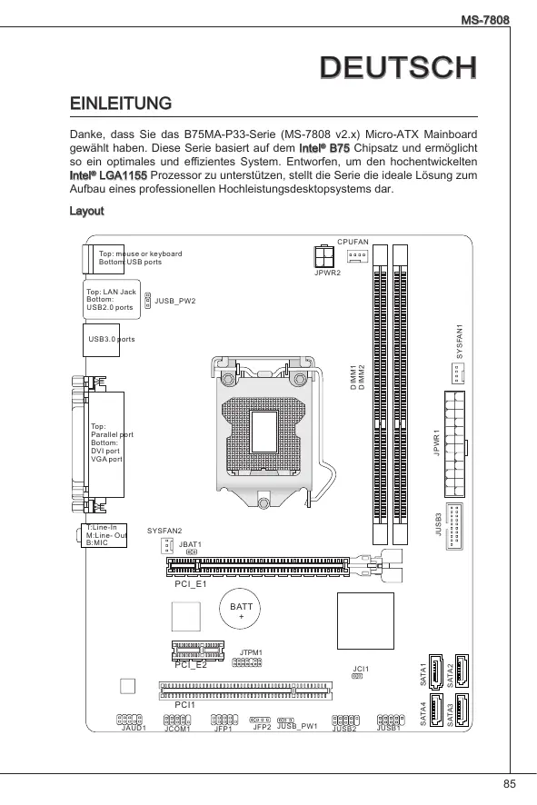 Suivez les instructions sur l'écran pour finir l'installation. MS-7808 Deutsch eINLEITUNG Danke, dass Sie das B75MA-P33-Serie (MS-7808 v2.x) Micro-ATX Mainboard gewählt haben. Diese Serie basiert auf dem Intel® B75 Chipsatz und ermöglicht so ein optimales und effizientes System. Entworfen, um den hochentwickelten Intel® LGA1155 Prozessor zu unterstützen, stellt die Serie die ideale Lösung zum Aufbau eines professionellen Hochleistungsdesktopsystems dar. Layout CPUFAN Top: mouse or keyboard Bottom:USB ports JPWR2 JUSB_PW2 SYSFAN1 Top: LAN Jack Bottom: USB2.0 ports DIMM1 DIMM2 USB3.0 ports JUSB3 T:Line-In M:Line- Out B:MIC JPWR1 Top: Parallel port Bottom: DVI port VGA port SYSFAN2 JBAT1 PCI_E1 BATT