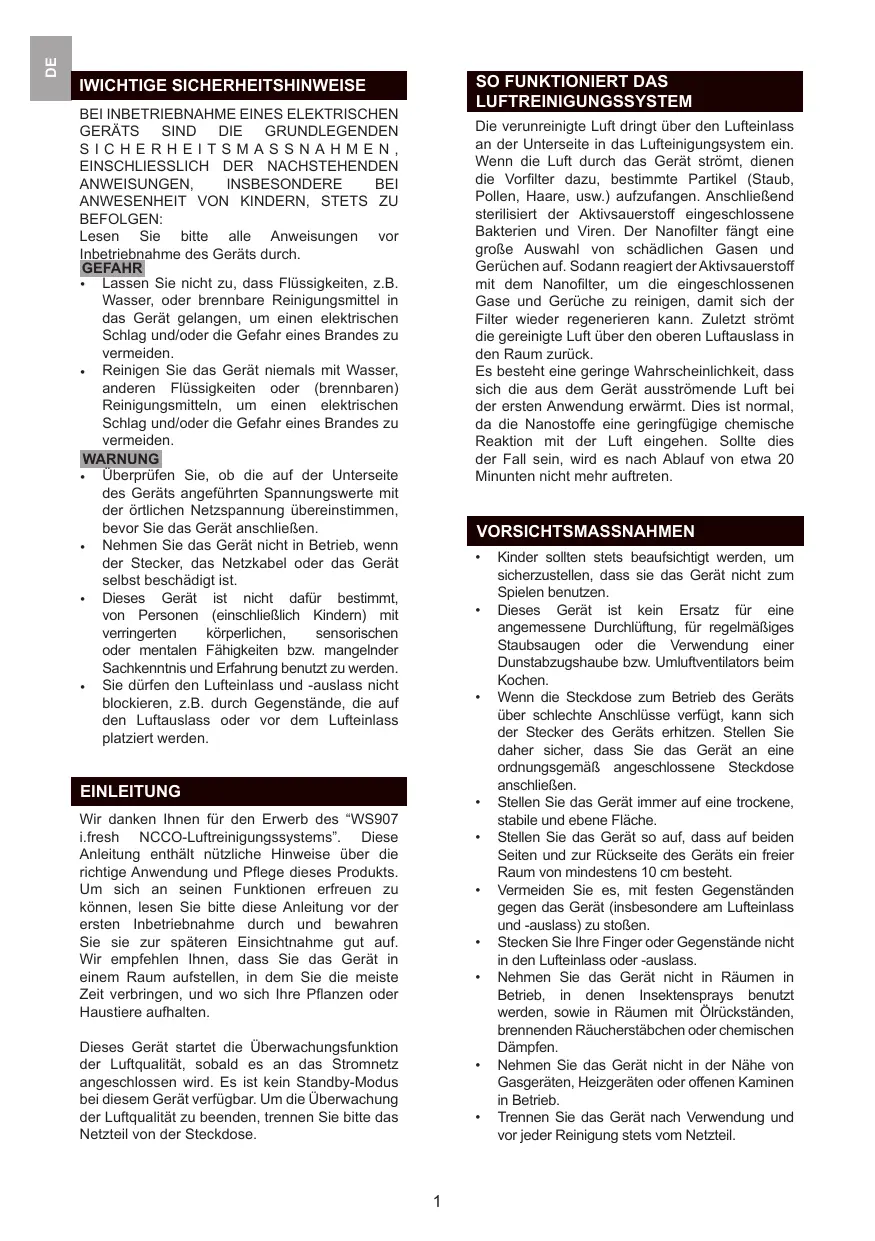Wir danken Ihnen für den Erwerb des “WS907 i.fresh NCCO-Luftreinigungssystems”. Diese Anleitung enthält nützliche Hinweise über die richtige Anwendung und Pflege dieses Produkts. Um sich an seinen Funktionen erfreuen zu können, lesen Sie bitte diese Anleitung vor der ersten Inbetriebnahme durch und bewahren Sie sie zur späteren Einsichtnahme gut auf. Wir empfehlen Ihnen, dass Sie das Gerät in einem Raum aufstellen, in dem Sie die meiste Zeit verbringen, und wo sich Ihre Pflanzen oder Haustiere aufhalten.