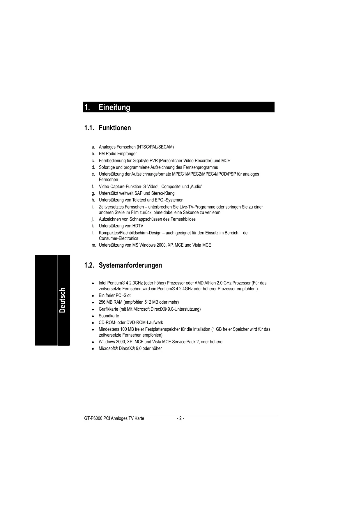 Analoges Fernsehen (NTSC/PAL/SECAM) FM Radio Empfänger Fernbedienung für Gigabyte PVR (Persönlicher Video-Recorder) und MCE Sofortige und programmierte Aufzeichnung des Fernsehprogramms Unterstützung der Aufzeichnungsformate MPEG1/MPEG2/MPEG4/IPOD/PSP für analoges Fernsehen f. Video-Capture-Funktion-‚S-Video’, ‚Composite’ und ‚Audio’ g. Unterstützt weltweit SAP und Stereo-Klang h. Unterstützung von Teletext und EPG.-Systemen i. Zeitversetztes Fernsehen – unterbrechen Sie Live-TV-Programme oder springen Sie zu einer anderen Stelle im Film zurück, ohne dabei eine Sekunde zu verlieren. j. Aufzeichnen von Schnappschüssen des Fernsehbildes k Unterstützung von HDTV l. Kompaktes/Flachbildschirm-Design – auch geeignet für den Einsatz im Bereich der Consumer-Electronics m. Unterstützung von MS Windows 2000, XP, MCE und Vista MCE