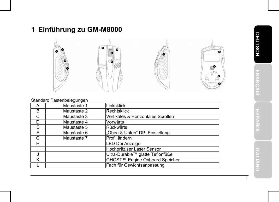 ESPAÑOL ITALIANO Standard Tastenbelegungen A Maustaste 1 B Maustaste 2 C Maustaste 3 D Maustaste 4 E Maustaste 5 F Maustaste 6 G Maustaste 7 H I J K L