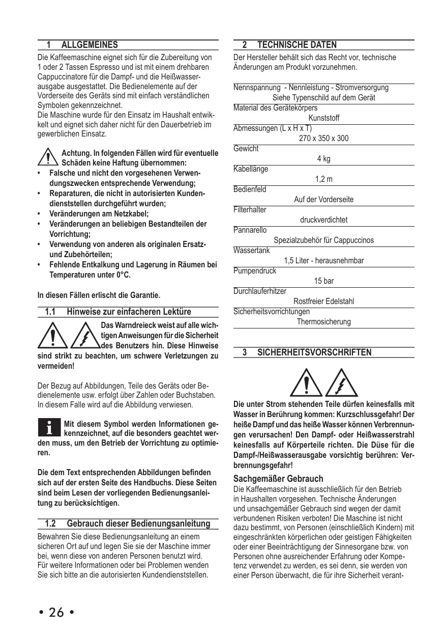 2 TECHNISCHE DATEN Die Kaffeemaschine eignet sich für die Zubereitung von 1 oder 2 Tassen Espresso und ist mit einem drehbaren Cappuccinatore für die Dampf- und die HeiBwasser- ausgabe ausgestattet. Die Bedienelemente auf der Vorderseite des Geräts sind mit einfach verständiichen Symbolen gekennzeichnet