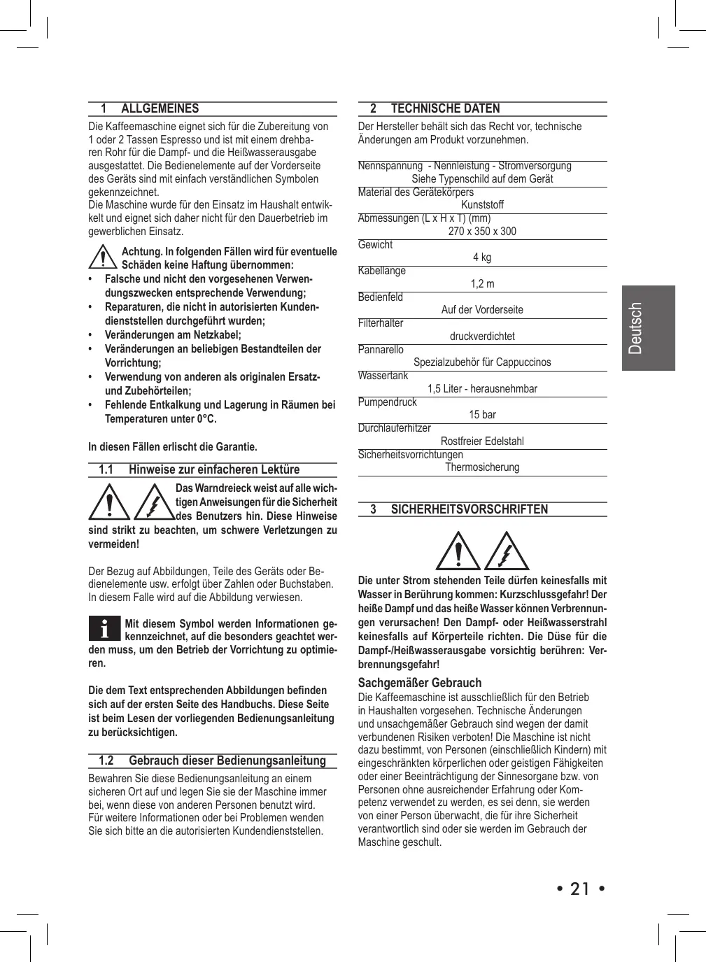 Gebrauch dieser Bedienungsanleitung Bewahren Sie diese Bedienungsanleitung an einem sicheren Ort auf und legen Sie sie der Maschine immer bei, wenn diese von anderen Personen benutzt wird. Für weitere Informationen oder bei Problemen wenden Sie sich bitte an die autorisierten Kundendienststellen. 2 Technische Daten Der Hersteller behält sich das Recht vor, technische Änderungen am Produkt vorzunehmen. Nennspannung - Nennleistung - Stromversorgung Siehe Typenschild auf dem Gerät Material des Gerätekörpers Kunststoff Abmessungen (L x H x T) (mm) 270 x 350 x 300 Gewicht 4 kg Kabellänge 1,2 m Bedienfeld Auf der Vorderseite Filterhalter druckverdichtet Pannarello Spezialzubehör für Cappuccinos Wassertank 1,5 Liter - herausnehmbar Pumpendruck 15 bar Durchlauferhitzer Rostfreier Edelstahl Sicherheitsvorrichtungen Thermosicherung 3 Sicherheitsvorschriften Die unter Strom stehenden Teile dürfen keinesfalls mit Wasser in Berührung kommen: Kurzschlussgefahr! Der heiße Dampf und das heiße Wasser können Verbrennungen verursachen! Den Dampf- oder Heißwasserstrahl keinesfalls auf Körperteile richten. Die Düse für die Dampf-/Heißwasserausgabe vorsichtig berühren: Verbrennungsgefahr! Sachgemäßer Gebrauch Die Kaffeemaschine ist ausschließlich für den Betrieb in Haushalten vorgesehen. Technische Änderungen und unsachgemäßer Gebrauch sind wegen der damit verbundenen Risiken verboten! Die Maschine ist nicht dazu bestimmt, von Personen (einschließlich Kindern) mit eingeschränkten körperlichen oder geistigen Fähigkeiten oder einer Beeinträchtigung der Sinnesorgane bzw. von Personen ohne ausreichender Erfahrung oder Kompetenz verwendet zu werden, es sei denn, sie werden von einer Person überwacht, die für ihre Sicherheit verantwortlich sind oder sie werden im Gebrauch der Maschine geschult.